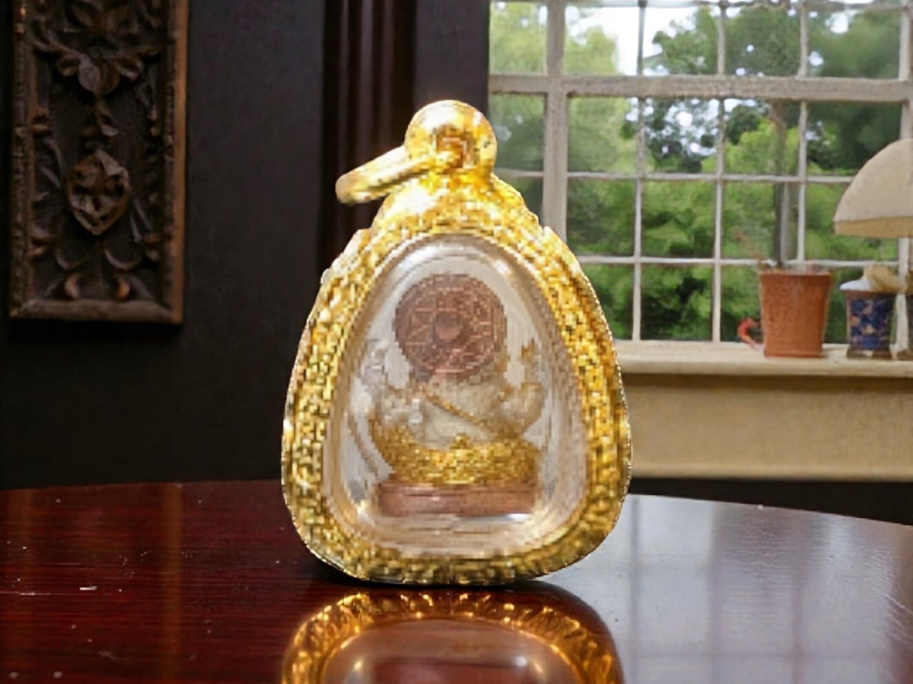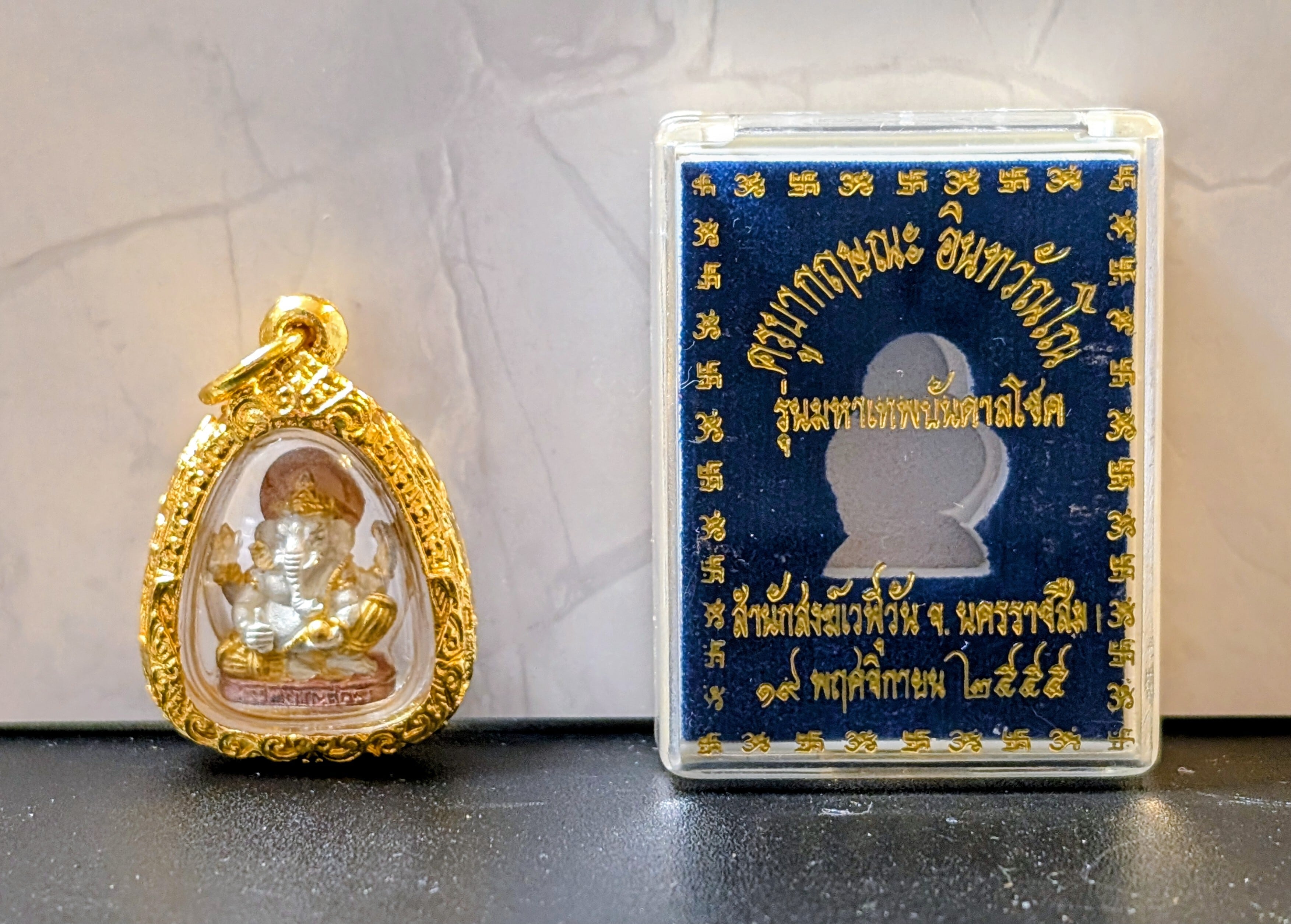 タイの現役高層クルバー・クリッサナのガネーシャをモチーフにしたブラクリン(小像)となります。このモデルは「マハテープ バンダン チョク」と呼ばれ、「幸運を授ける偉大な神」を意味しており、幸運と商売の成功にご利益があるとされています。トーンマイクローン枠入り。元箱あり。専門店より入手。