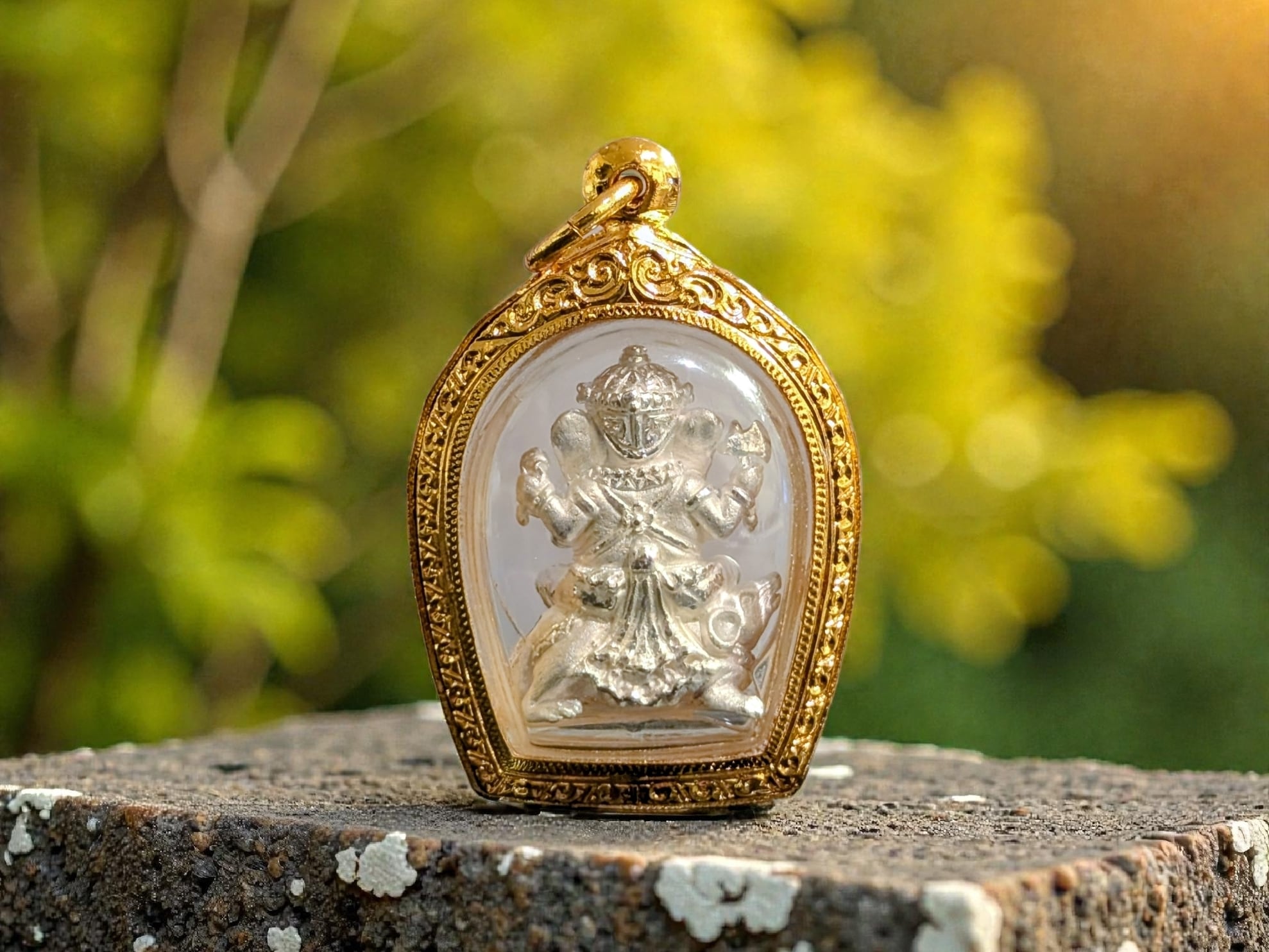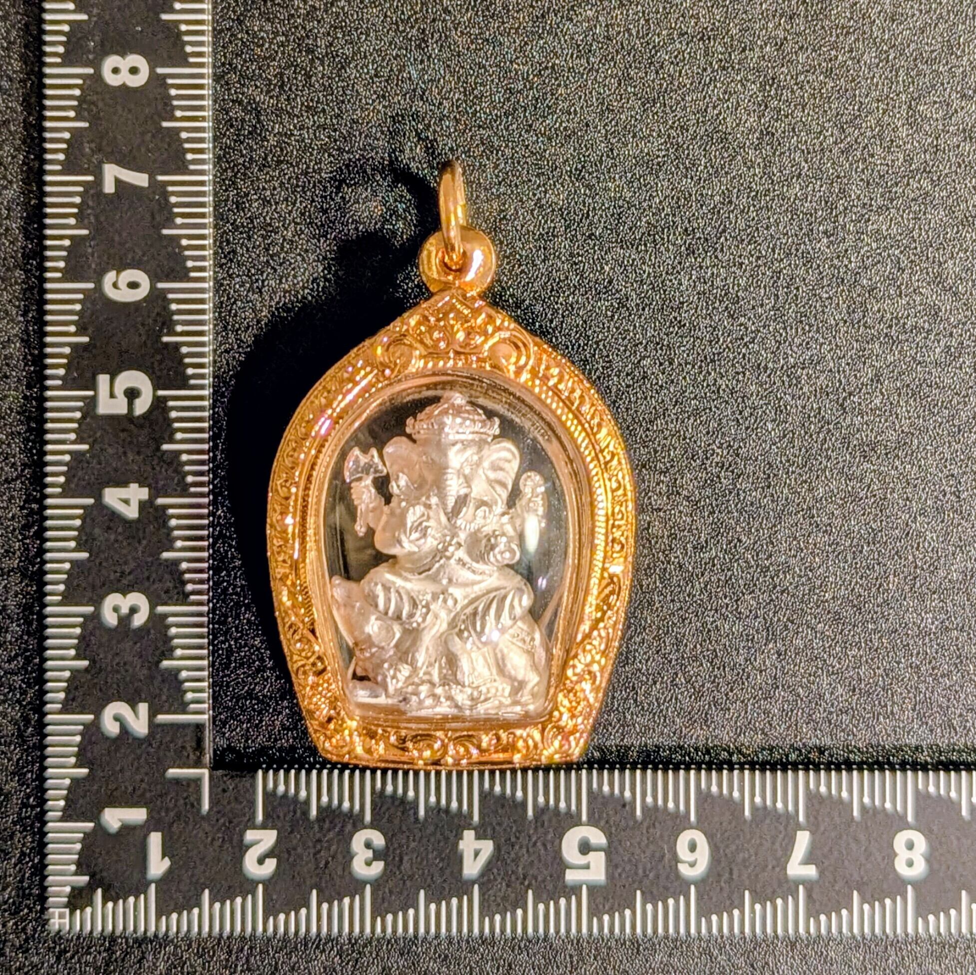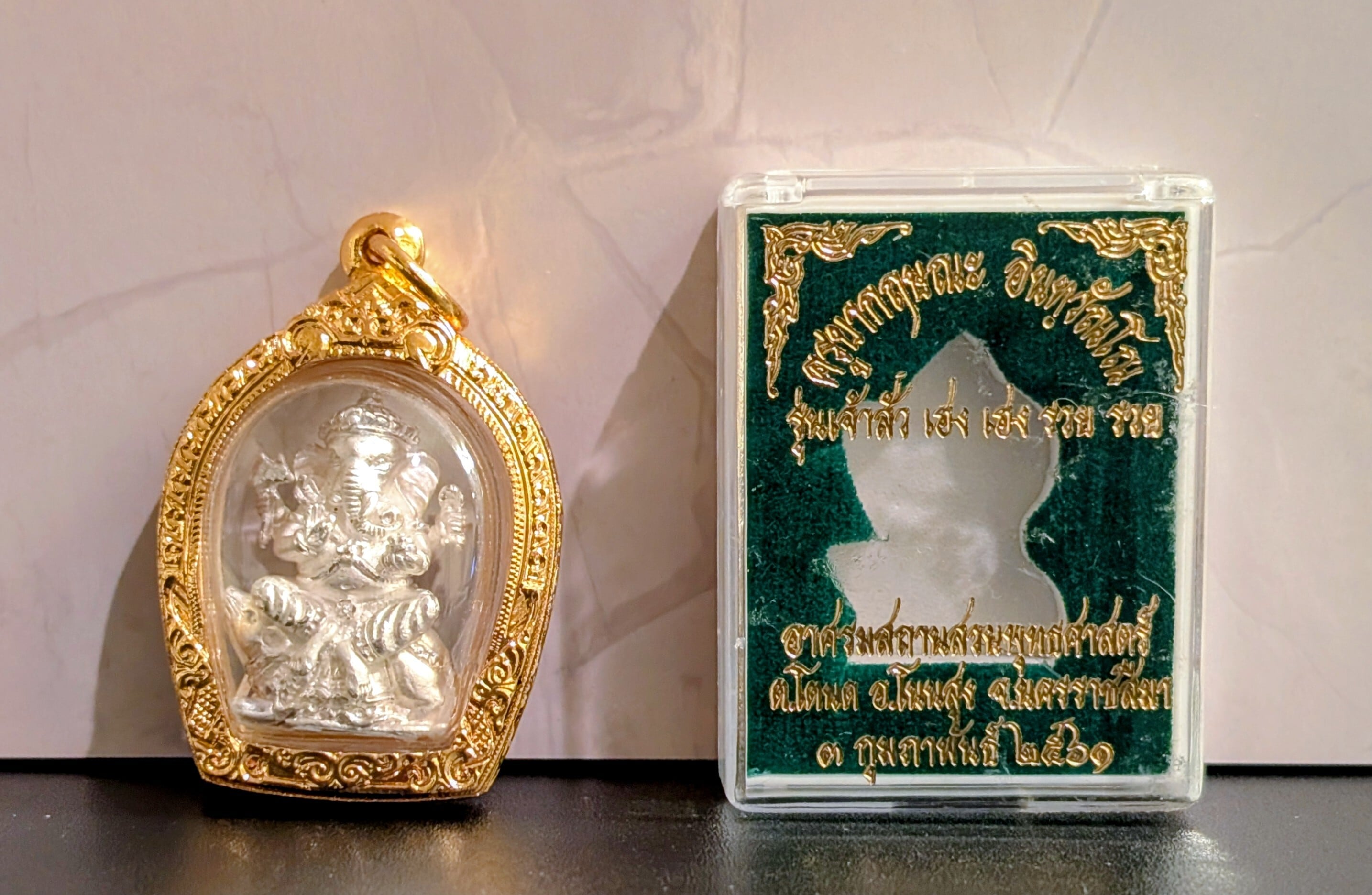タイの現役高層クルバー・クリッサナのガネーシャをモチーフにした小像となります。大きなネズミに座るガネーシャの独特のデザインです。金運にご利益があるとされています。トーンマイクローン枠入り。元箱あり。専門店より入手。