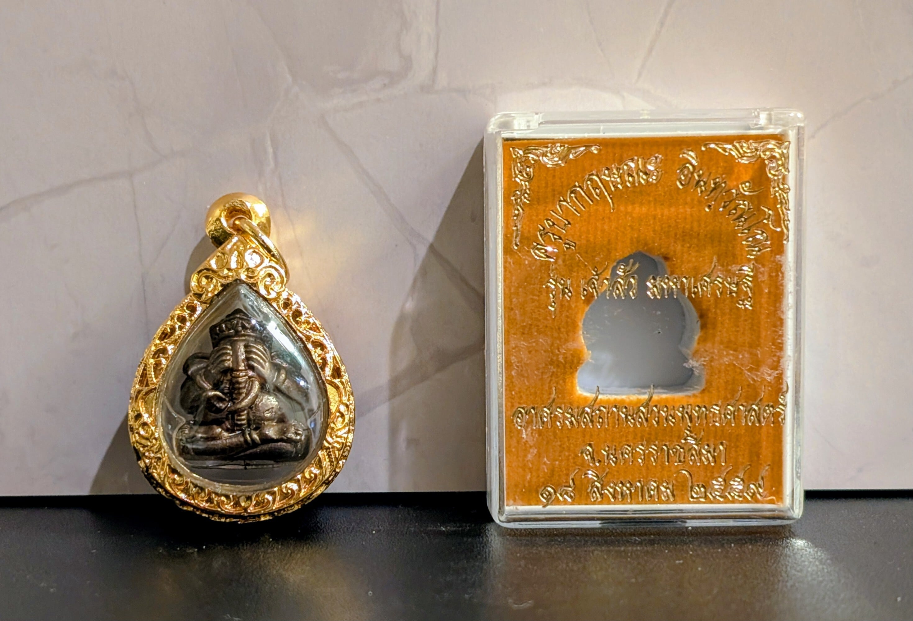 タイの現役高層クルバー・クリッサナのガネーシャをモチーフにした小型の玉形ガネーシャプラとなります。金運にご利益があるとされています。トーンマイクローン枠入り。元箱あり。専門店より入手。