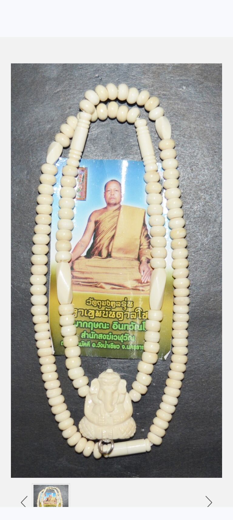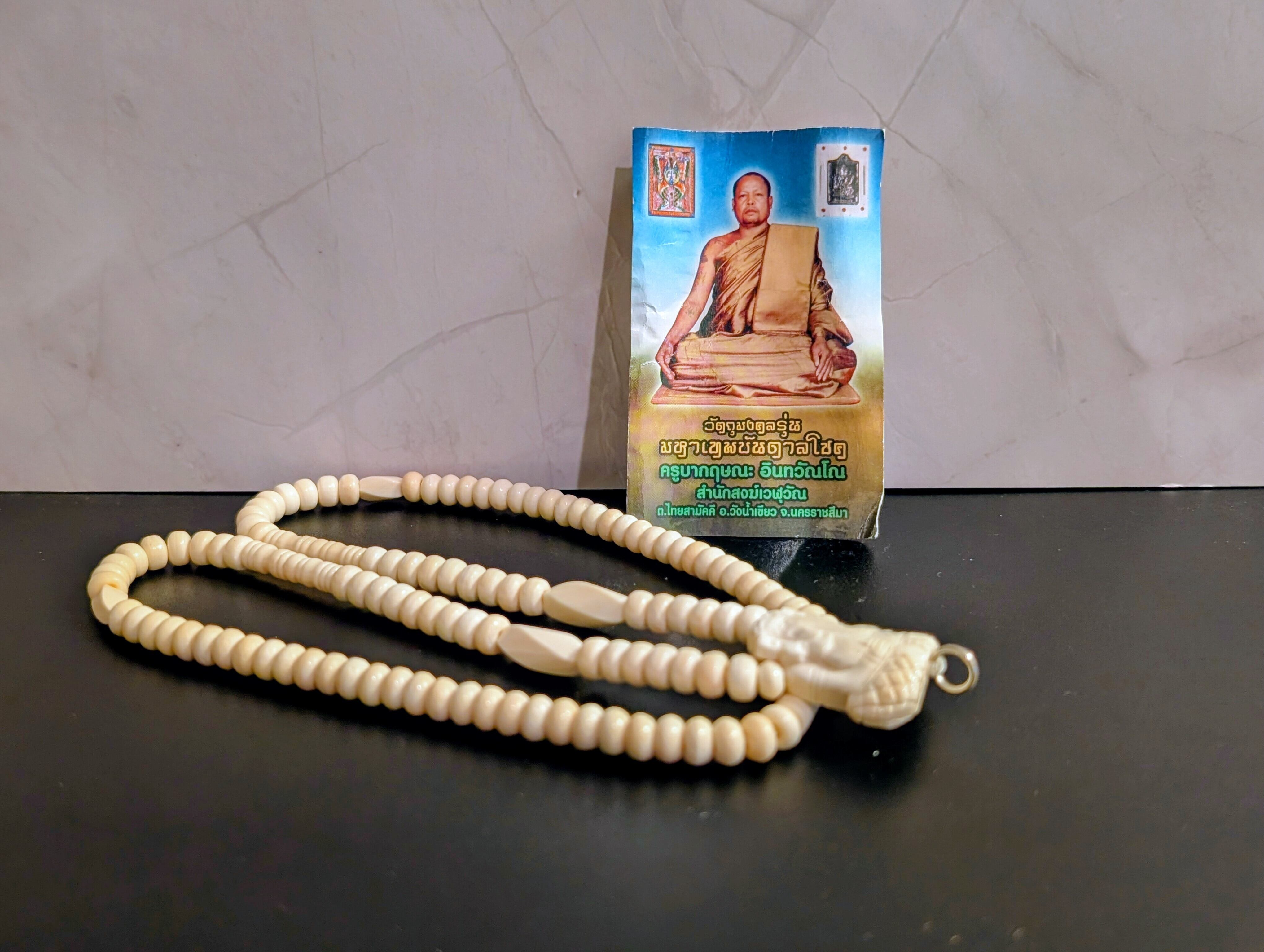 タイの現役高層クルバー・クリッサナの象骨とプラ・ピカネットのビーズネックレスとなります。プラ・ピカネートの象骨を熟練の職人が手作業で丁寧に作り上げ、神聖なヤントとシリアル番号が刻まれ、背面のリングで留められています。ネックレスとビーズはすべて象骨で作られており、開閉可能です。299個限定で製作されています。ご利益は、幸運・富・健康・幸福をもたらし、幸運と繁栄をもたらし、不運や事故から守り、運気を大幅に高め、人生のあらゆる障害を乗り越える力があるとされています。専門店より入手。
