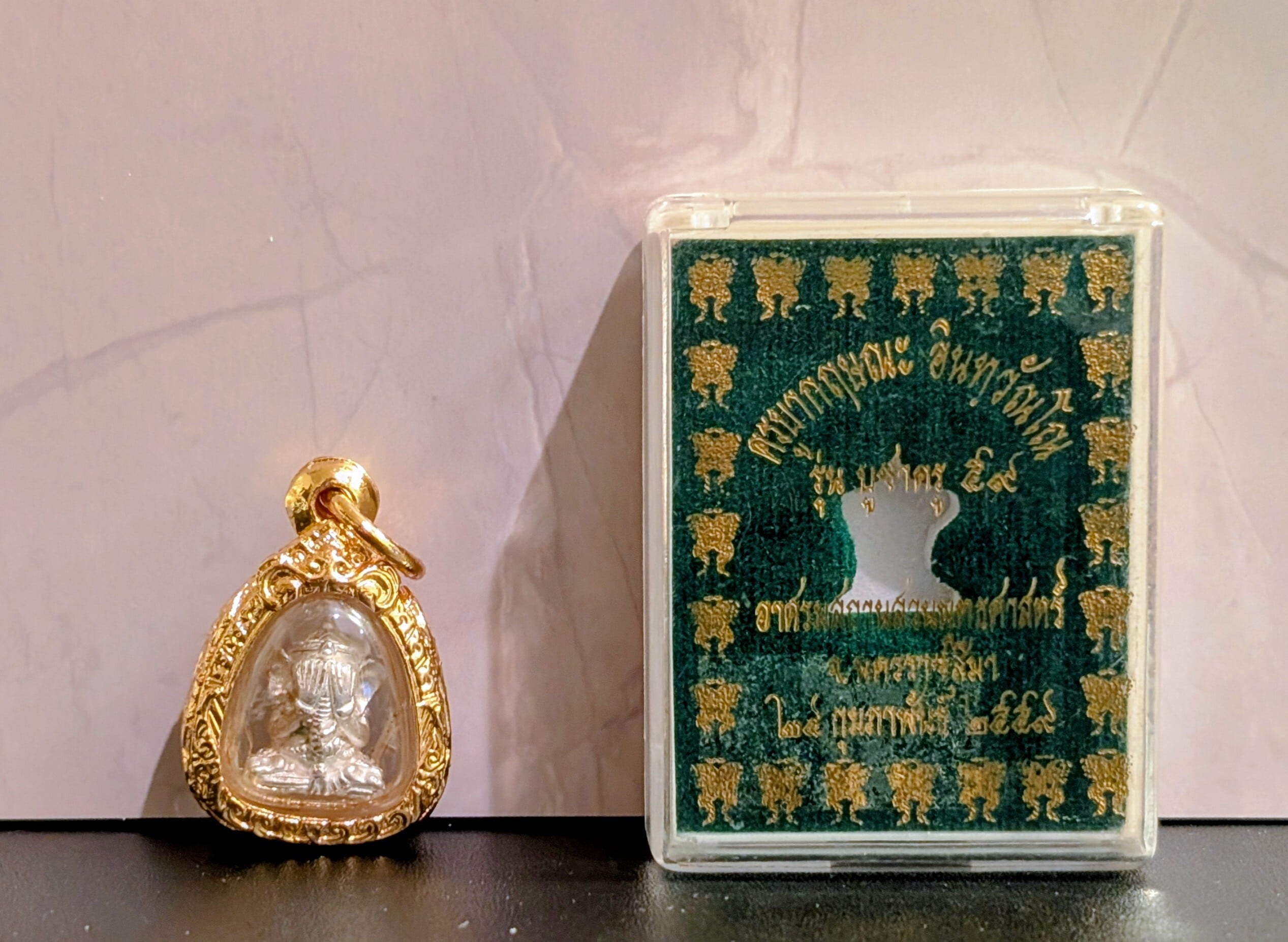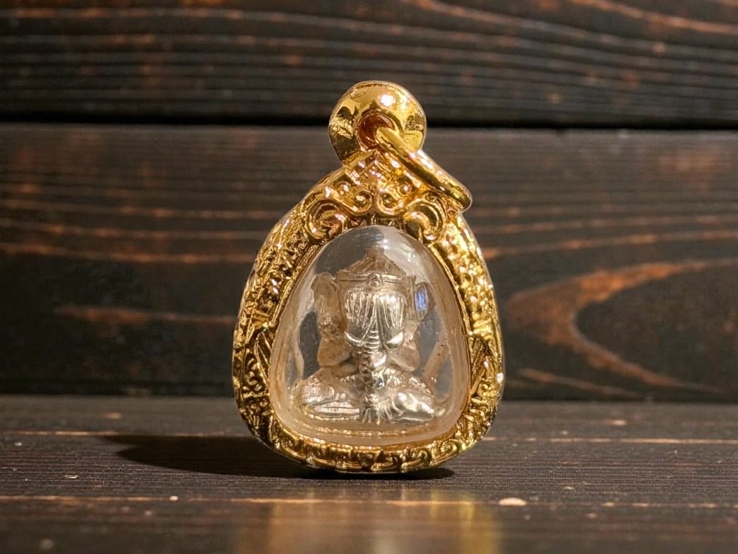 タイの現役高層クルバー・クリッサナのガネーシャをモチーフにした小像プラで「大と小」の2サイズのうち「小サイズ」となります。「水に浮かぶガネーシャ」モデルと呼ばれ、慈悲の心、商売繁盛、そしてあらゆる災難からの守護を願う、仏教の祝福が込められた至高のお守りとされています。トーンマイクローン枠入り。元箱あり。専門店より入手。