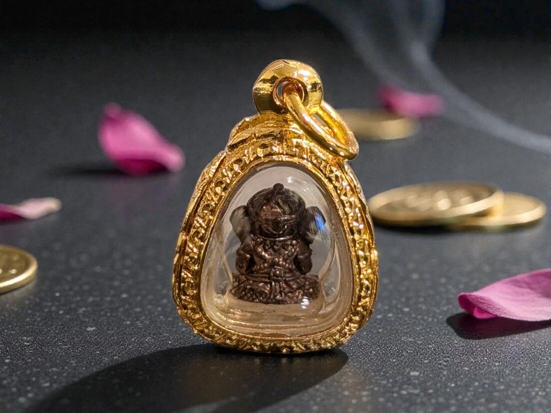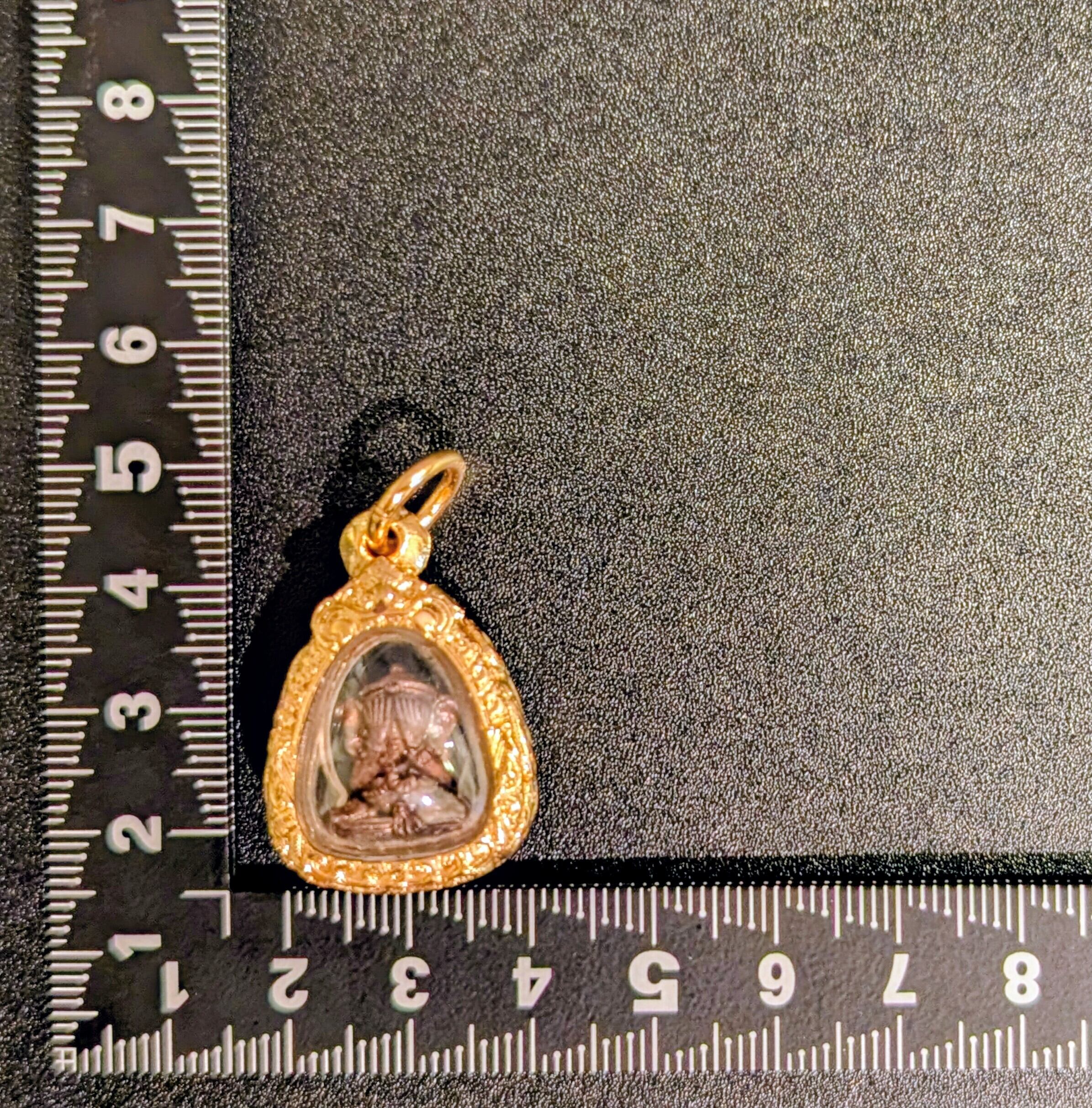 タイの現役高層クルバー・クリッサナのガネーシャをモチーフにした小像プラで「大と小」の2サイズのうち「小サイズ」となります。「水に浮かぶガネーシャ」モデルと呼ばれ、慈悲の心、商売繁盛、そしてあらゆる災難からの守護を願う、仏教の祝福が込められた至高のお守りとされています。トーンマイクローン枠入り。元箱あり。専門店より入手。