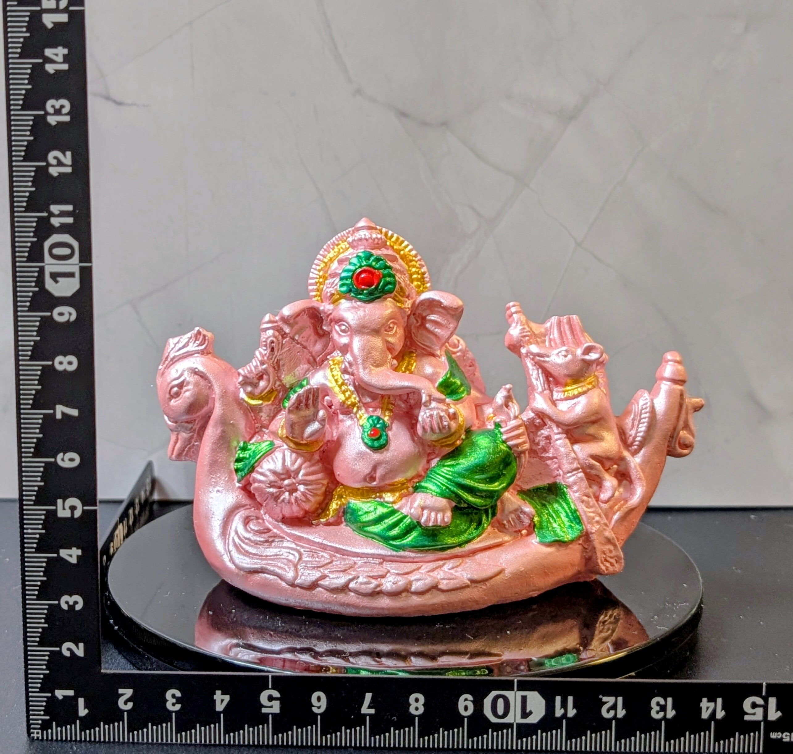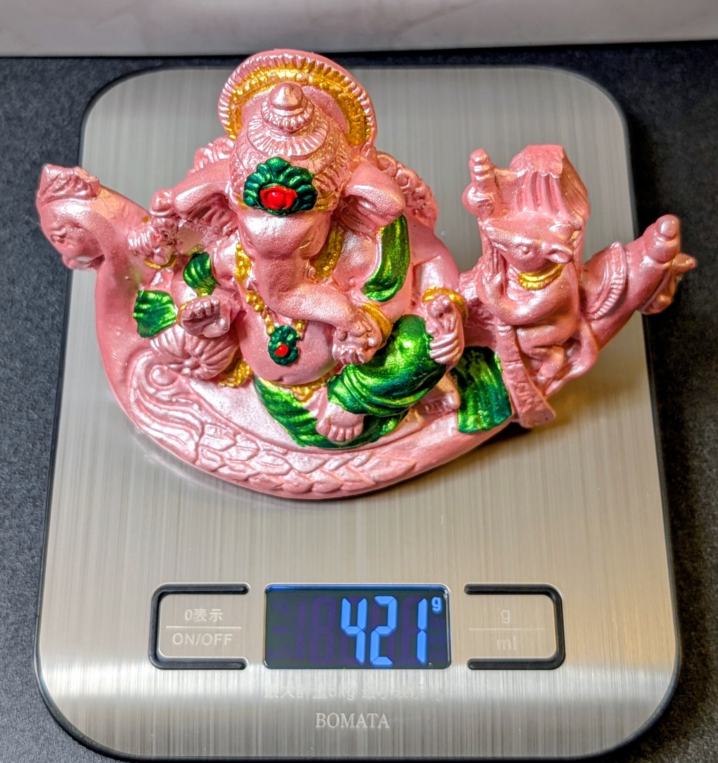 チャチュンサオ県の『ピンクのガネーシャ』の巨像で有名なワット・サマーンラッタナーラーム境内の売店より入手。ガネーシャがネズミの船頭で白鳥の船に乗って進む姿を描いた愛らしい置物です。