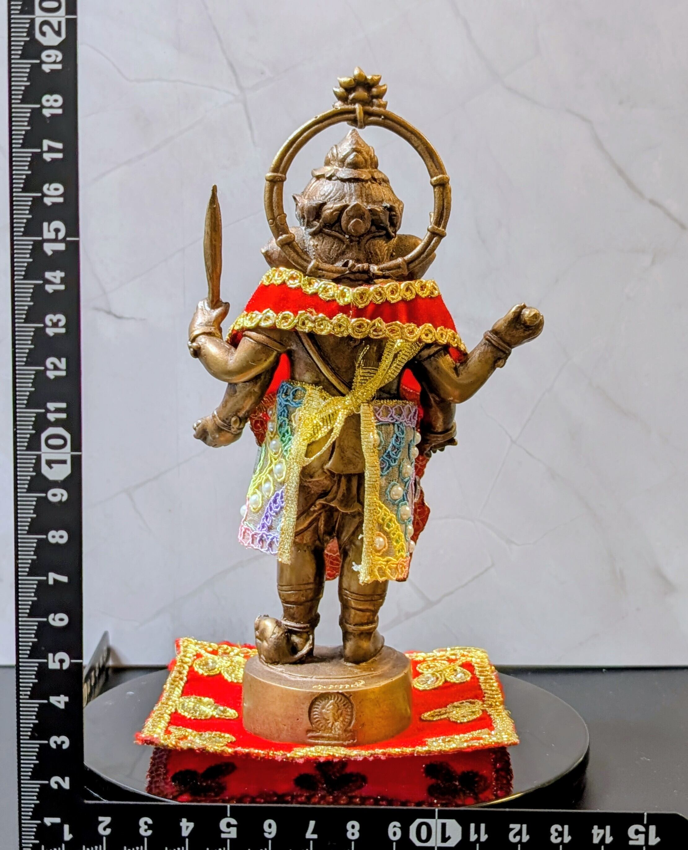 チャチュンサオ県内で『ピンクのガネーシャ』の巨像で有名なワット・サマーンラッタナーラームと並ぶガネーシャの聖地『クローンクアン公園』作成のガネーシャ像となります。同公園の象徴的存在で、台座を含め高さ39メートルの世界最大のブロンズ製ガネーシャ像をモデルとし、存在感のある6インチサイズの像となります。画像に映る敷物及び服飾付きです。同公園より入手。