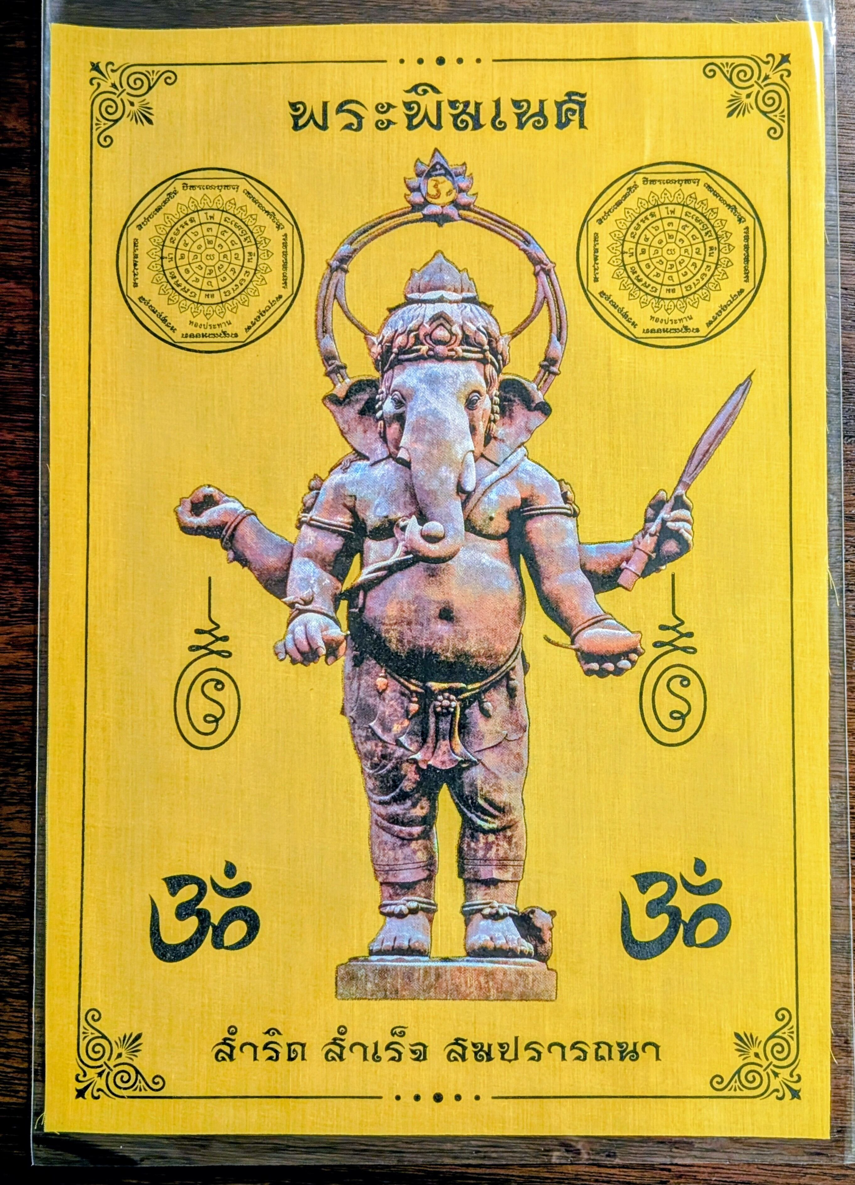 チャチュンサオ県内で『ピンクのガネーシャ』の巨像で有名なワット・サマーンラッタナーラームと並ぶガネーシャの聖地『クローンクアン公園』で販売のパーヤンとなります。同公園の象徴である巨大ガネーシャ像をデザインしたもので、パーヤン下部には『サムリット サムレッツ ソム・プラッタナー』とタイ語で書かれ、これは「(すべての物事が)成就し、成功し、望み通りに叶いますように」を意味しており、パーヤンに祈りを捧げることで「成功と願望成就」のご利益があるとされています。このパーヤンはイエローですが、色のバリエーションは7色あります。同公園より入手。