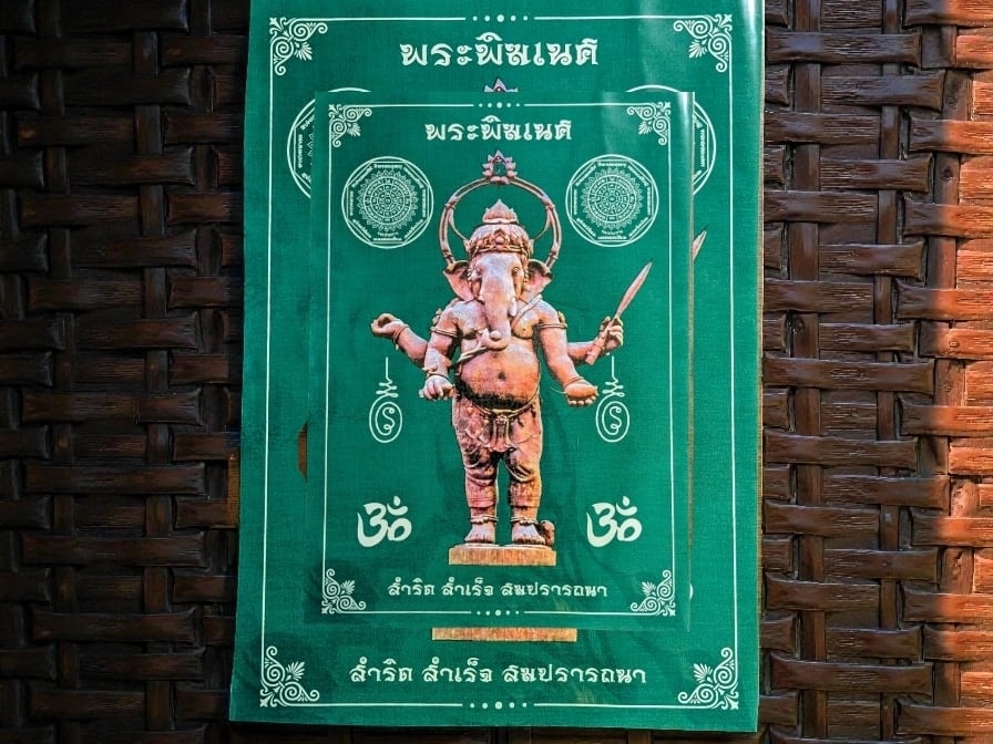 チャチュンサオ県内で『ピンクのガネーシャ』の巨像で有名なワット・サマーンラッタナーラームと並ぶガネーシャの聖地『クローンクアン公園』で販売のパーヤンとなります。同公園の象徴である巨大ガネーシャ像をデザインしたもので、パーヤン下部には『サムリット サムレッツ ソム・プラッタナー』とタイ語で書かれ、これは「(すべての物事が)成就し、成功し、望み通りに叶いますように」を意味しており、パーヤンに祈りを捧げることで「成功と願望成就」のご利益があるとされています。このパーヤンはグリーンですが、色のバリエーションは7色あります。同公園より入手。