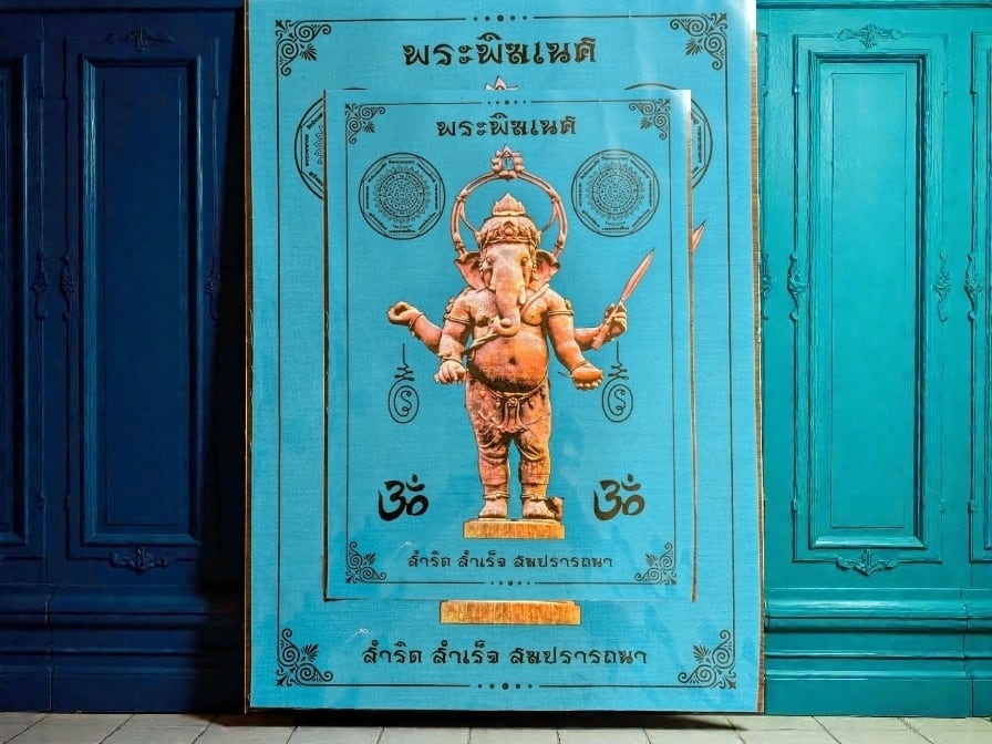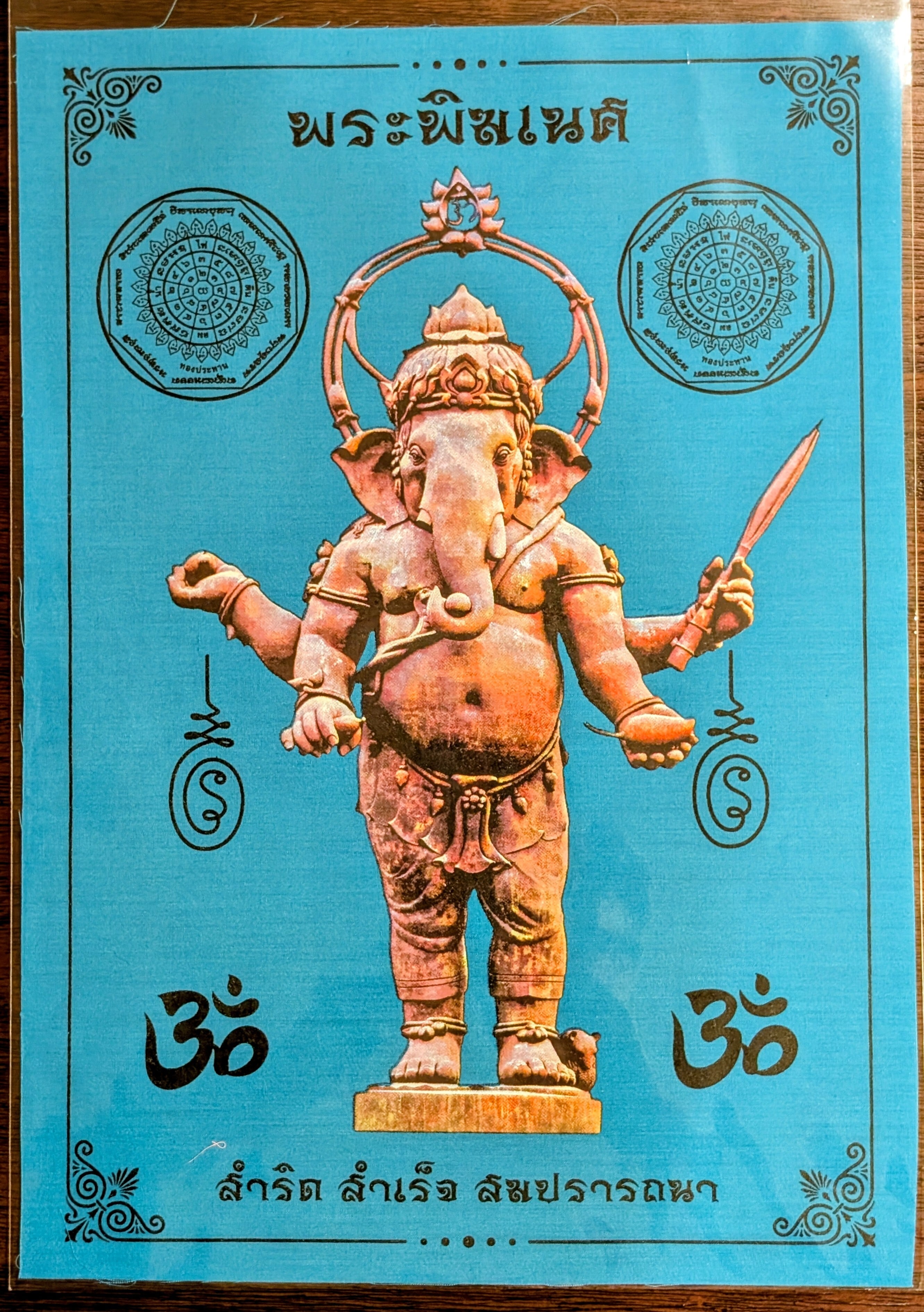 チャチュンサオ県内で『ピンクのガネーシャ』の巨像で有名なワット・サマーンラッタナーラームと並ぶガネーシャの聖地『クローンクアン公園』で販売のパーヤンとなります。同公園の象徴である巨大ガネーシャ像をデザインしたもので、パーヤン下部には『サムリット サムレッツ ソム・プラッタナー』とタイ語で書かれ、これは「(すべての物事が)成就し、成功し、望み通りに叶いますように」を意味しており、パーヤンに祈りを捧げることで「成功と願望成就」のご利益があるとされています。このパーヤンはブルーですが、色のバリエーションは7色あります。同公園より入手。