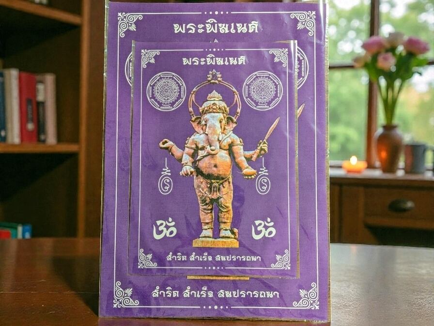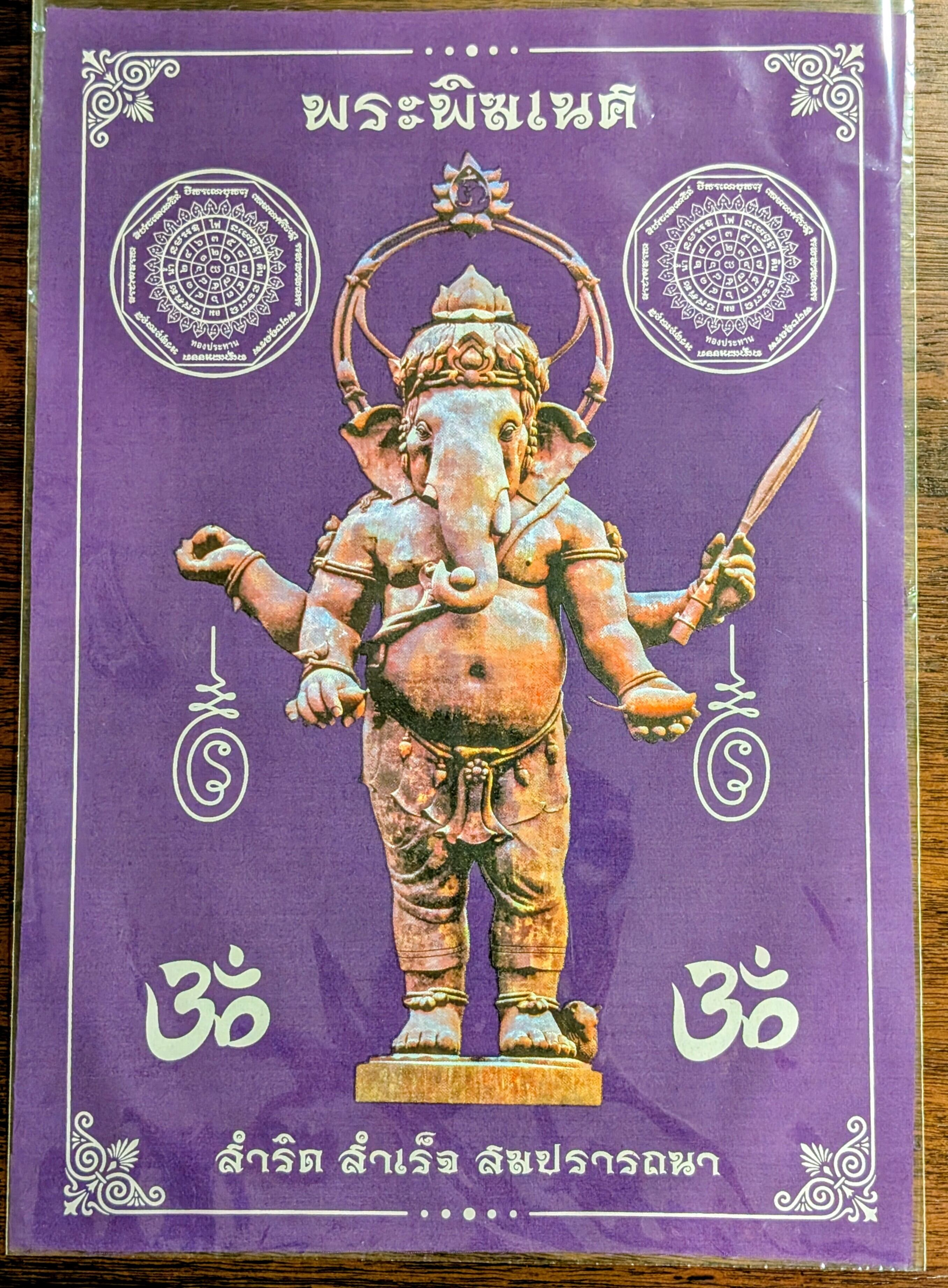 チャチュンサオ県内で『ピンクのガネーシャ』の巨像で有名なワット・サマーンラッタナーラームと並ぶガネーシャの聖地『クローンクアン公園』で販売のパーヤンとなります。同公園の象徴である巨大ガネーシャ像をデザインしたもので、パーヤン下部には『サムリット サムレッツ ソム・プラッタナー』とタイ語で書かれ、これは「(すべての物事が)成就し、成功し、望み通りに叶いますように」を意味しており、パーヤンに祈りを捧げることで「成功と願望成就」のご利益があるとされています。このパーヤンはパープルですが、色のバリエーションは7色あります。同公園より入手。