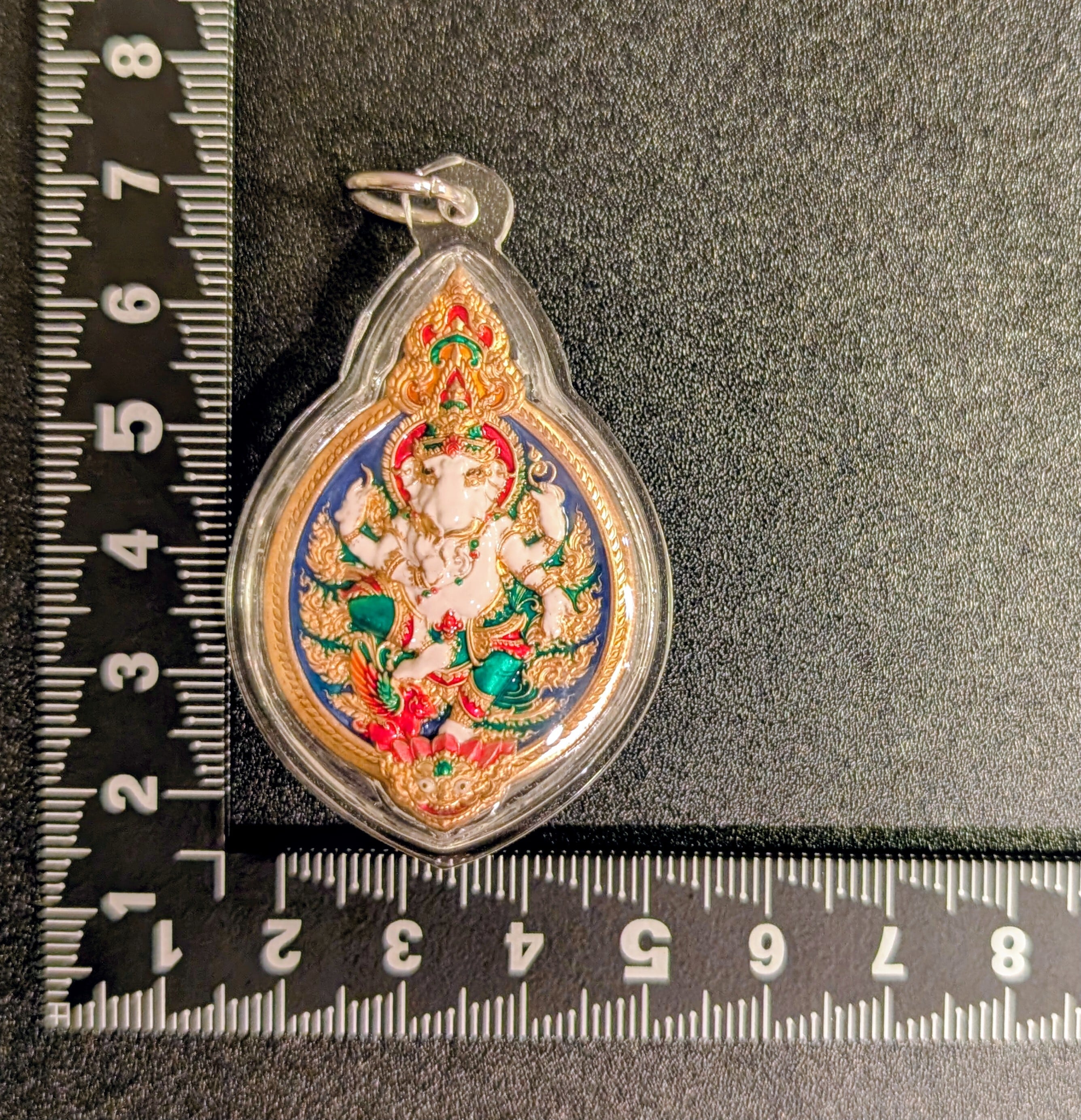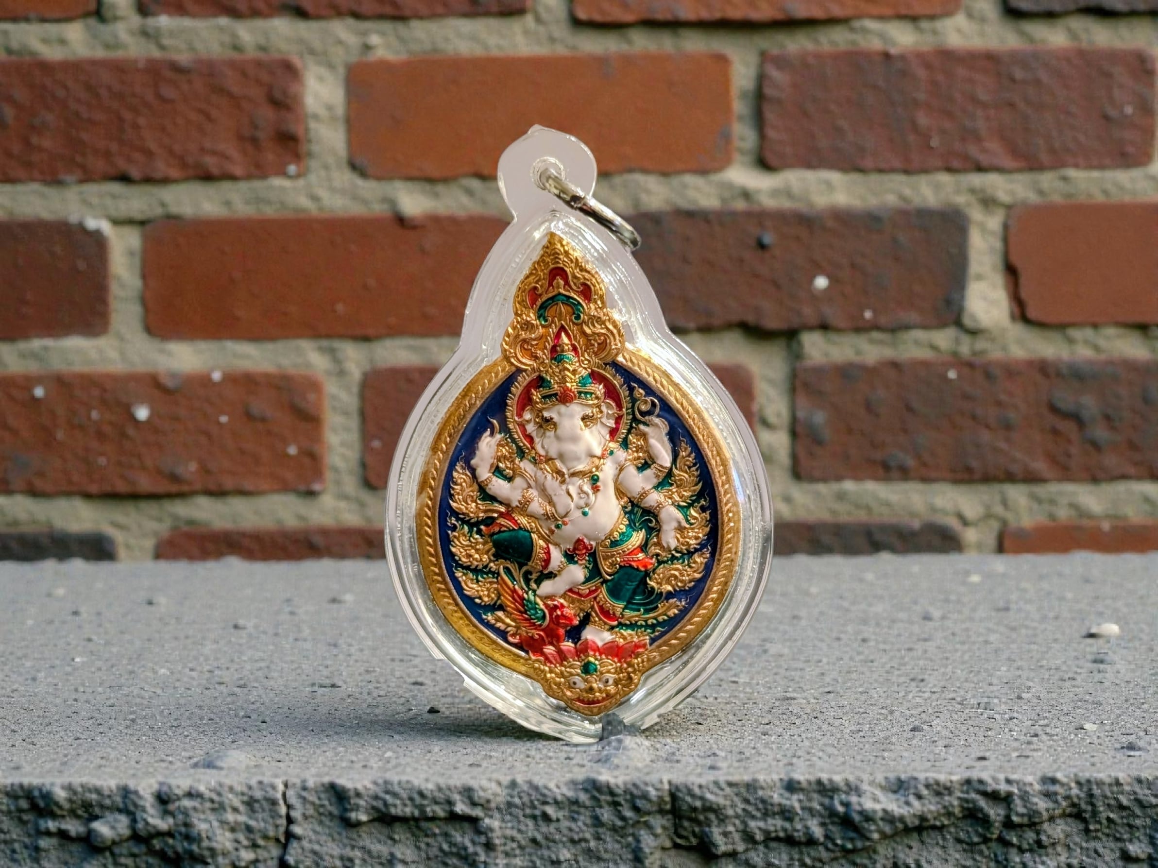 白色のガネーシャが非常に美しく、精巧な装飾が施された素晴らしいリアンです。ナコーンパトム県バンレン郡のブッダ・ブチャ瞑想センターにて、ルアン・ポーヴィチット師ほかの祈祷を受けて発行されたプラ。同センター内にあるセナ・セナ・タヴォーンワットの修復のための資金を得るために発行されたものです。 限定299個発行、シリアルナンバー15、プラスチックガンナーム枠入り。元箱あり。専門店より入手。