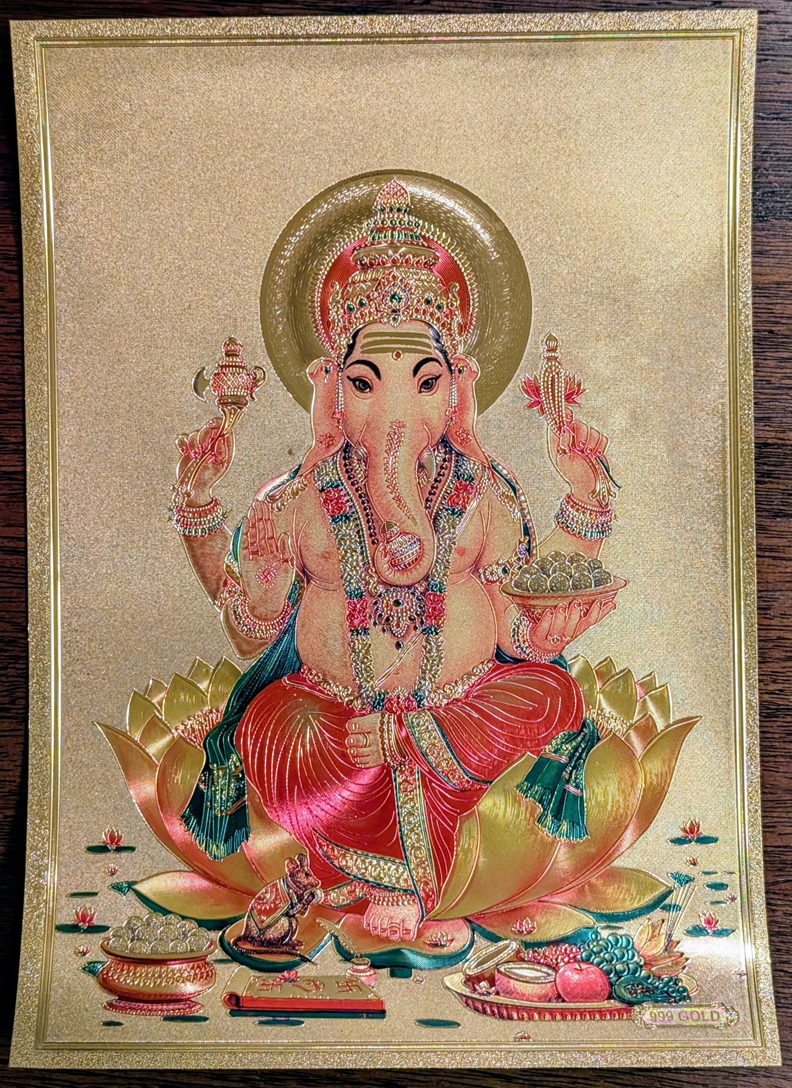 ガネーシャは「困難を取り除き、成功をもたらす神」として、インドをはじめ世界中で非常に人気があります。このポスターに描かれている主な特徴は以下のとおりです。