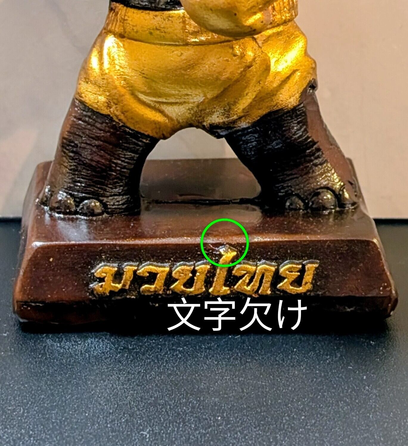 タイのマーケットで買い付けてきた、現地ならではのセンスが光るレジン像です。伝統的な神像の枠を超えたポップなデザインは、タイの若手クリエイターやコレクターの間でも人気。ブロンズ調のアンティークな塗装が施されているため、個性的でありながらも高級感があり、インテリアとして非常にかっこよく決まります。ムエタイ好きの方、タイ雑貨コレクターの方へのプレゼントにも最適です。ただ、台座のタイ文字の一部に「欠け」(画像8枚目ご参照)が見られますので、【ジャンク品】扱いとして値引きをさせていただいております。完璧を求める方やこうした「欠け」がお気になる方はご遠慮ください。