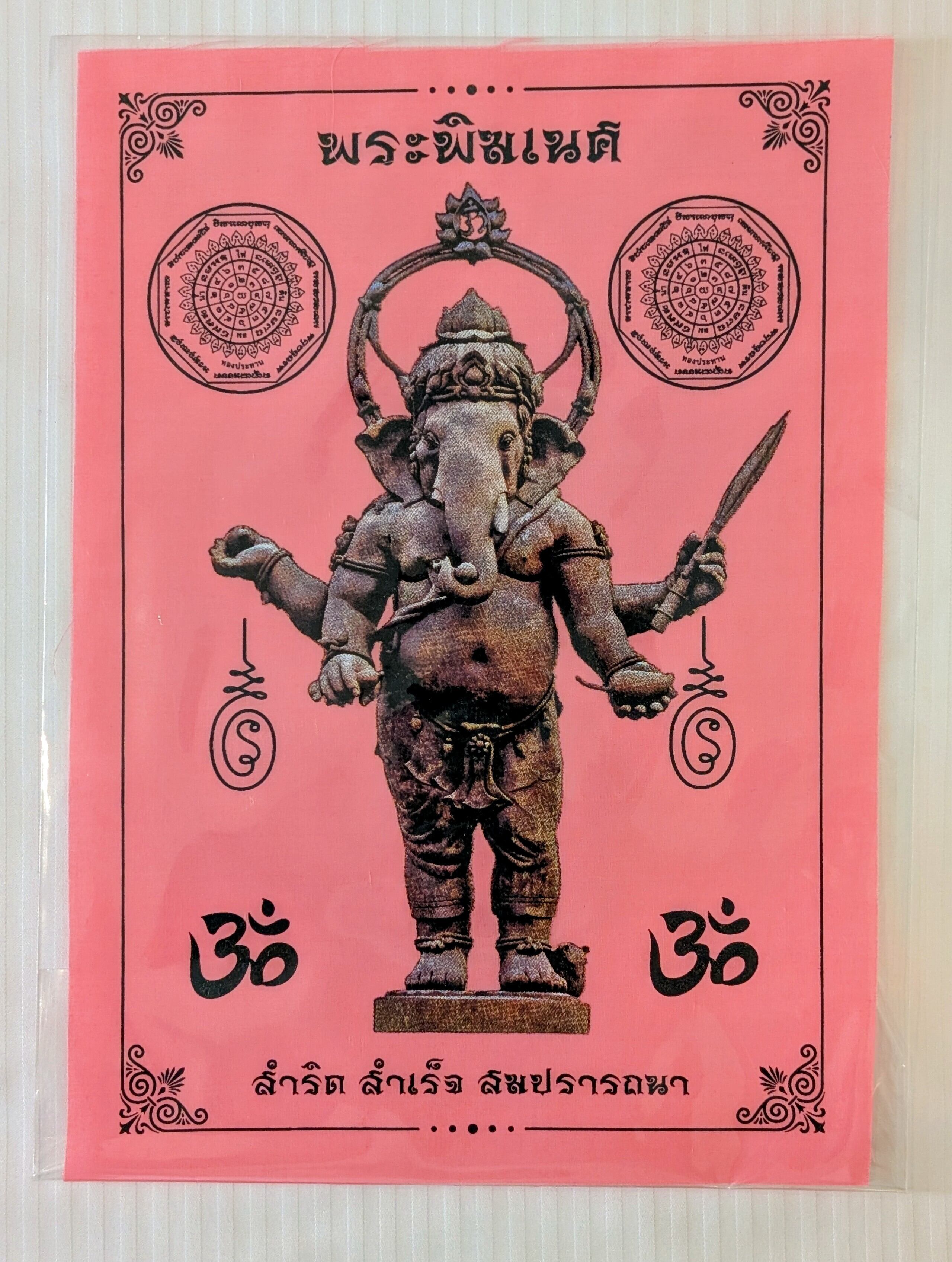 チャチュンサオ県内で『ピンクのガネーシャ』の巨像で有名なワット・サマーンラッタナーラームと並ぶガネーシャの聖地『クローンクアン公園』で販売のパーヤンとなります。同公園の象徴である巨大ガネーシャ像をデザインしたもので、パーヤン下部には『サムリット サムレッツ ソム・プラッタナー』とタイ語で書かれ、これは「(すべての物事が)成就し、成功し、望み通りに叶いますように」を意味しており、パーヤンに祈りを捧げることで「成功と願望成就」のご利益があるとされています。このパーヤンはピンクですが、色のバリエーションは7色あります。同公園より入手。なお、過去に入荷したものはA3サイズでしたが、今回はA4サイズで仕入れできたため、簡易フレームに入れてお届けいたします。