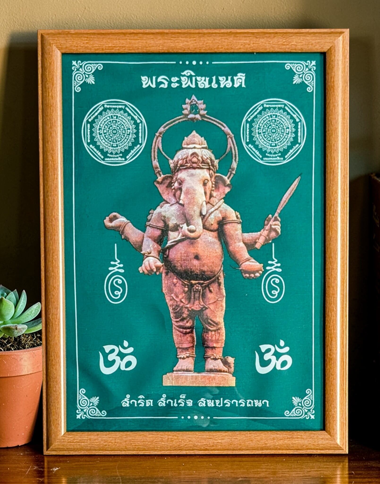 チャチュンサオ県内で『ピンクのガネーシャ』の巨像で有名なワット・サマーンラッタナーラームと並ぶガネーシャの聖地『クローンクアン公園』で販売のパーヤンとなります。同公園の象徴である巨大ガネーシャ像をデザインしたもので、パーヤン下部には『サムリット サムレッツ ソム・プラッタナー』とタイ語で書かれ、これは「(すべての物事が)成就し、成功し、望み通りに叶いますように」を意味しており、パーヤンに祈りを捧げることで「成功と願望成就」のご利益があるとされています。このパーヤンはグリーンですが、色のバリエーションは7色あります。同公園より入手。なお、過去に入荷したものはA3サイズでしたが、今回はA4サイズで仕入れできたため、簡易フレームに入れてお届けいたします。