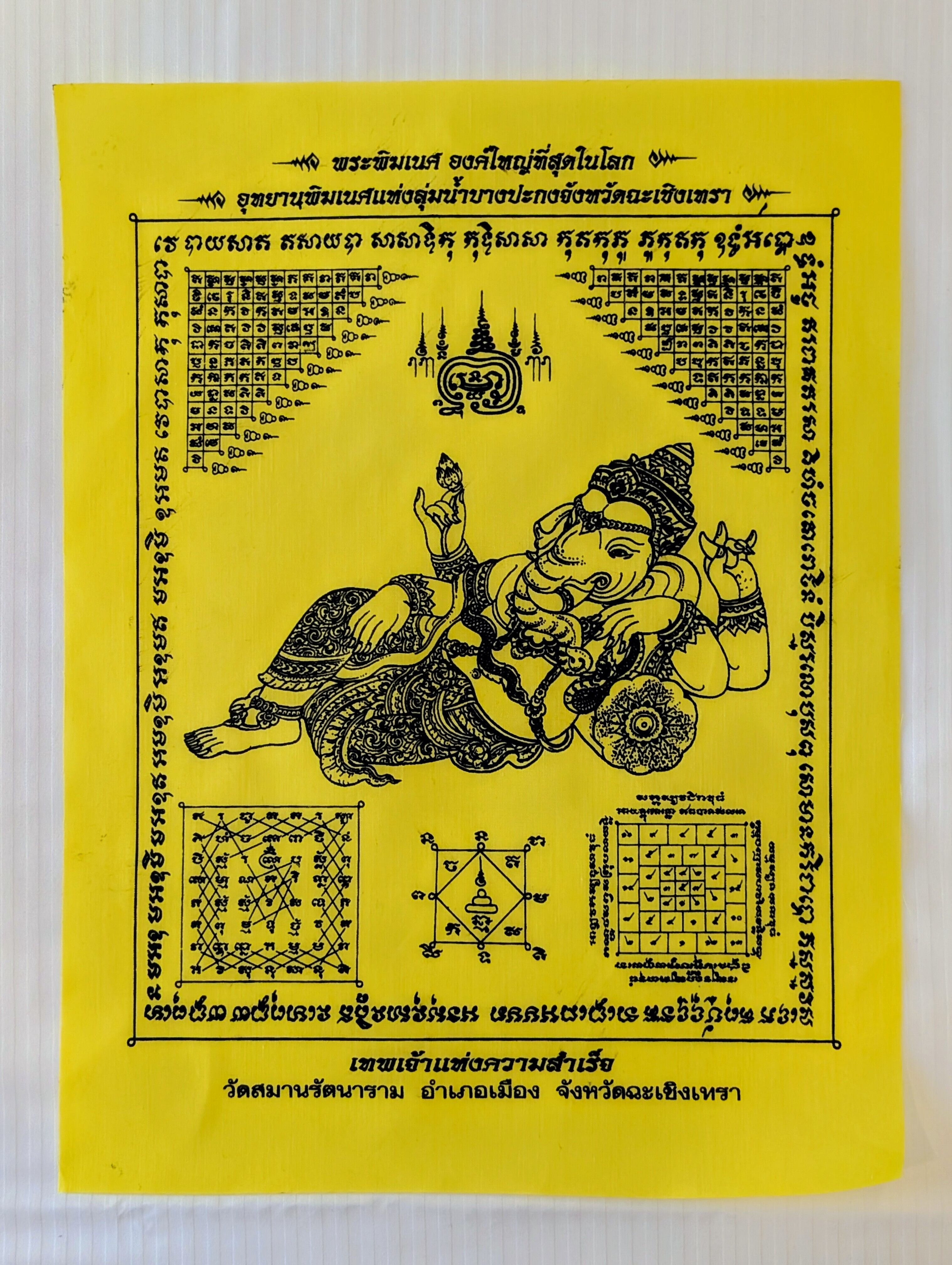 タイ・チャチュンサオ県が誇る最強のパワースポット「ワット・サマーン・ラッタナラム」にて、実際に祈祷(プッタピセーク)を受けた聖なる布、パーヤンです。中央には、あらゆる困難を打ち砕き、最速で願いを叶えると言われる「寝そべりガネーシャ神」が描かれ、周囲は神聖な幾何学模様「ヤント」で囲まれています。