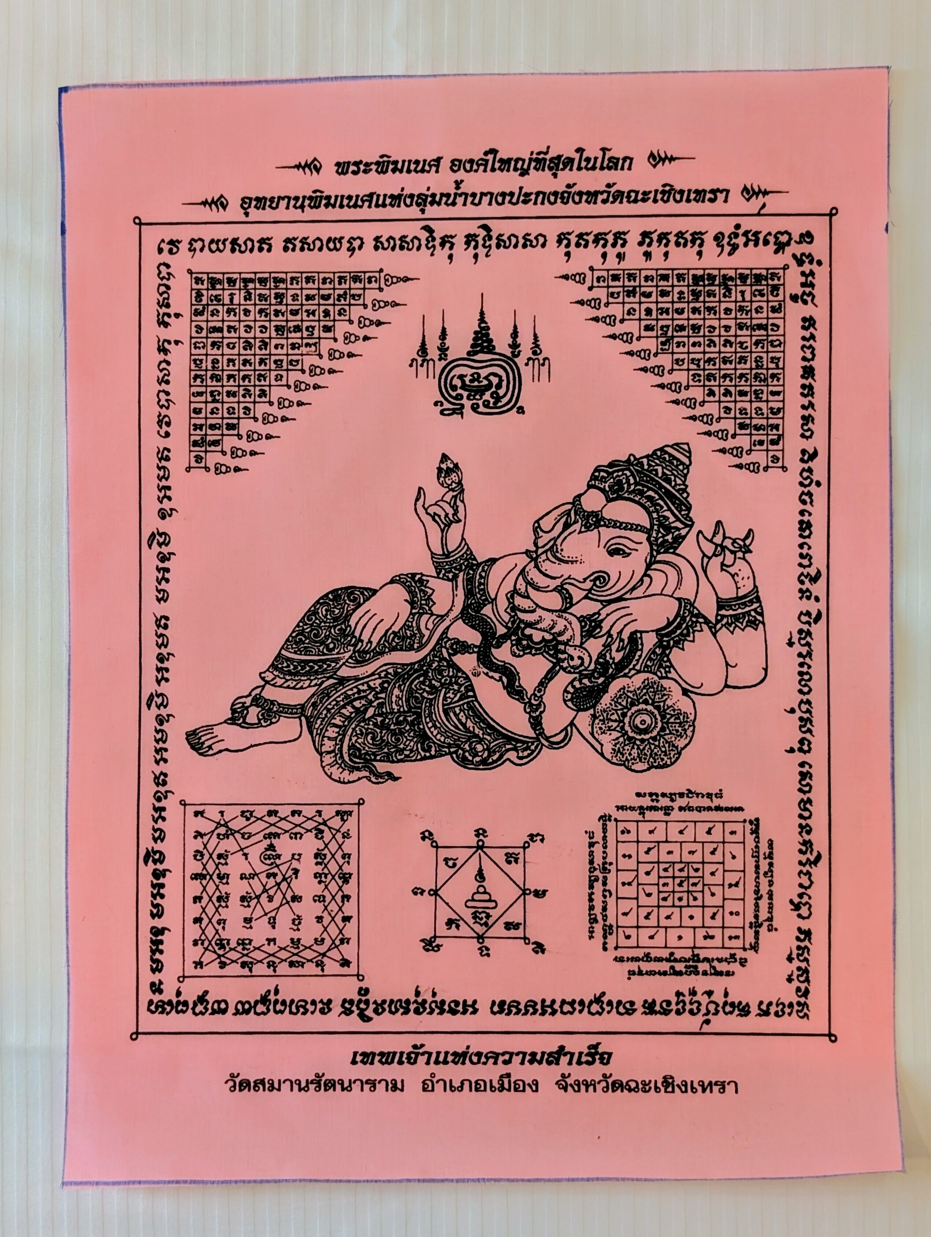 タイ・チャチュンサオ県が誇る最強のパワースポット「ワット・サマーン・ラッタナラム」にて、実際に祈祷(プッタピセーク)を受けた聖なる布、パーヤンです。中央には、あらゆる困難を打ち砕き、最速で願いを叶えると言われる「寝そべりガネーシャ神」が描かれ、周囲は神聖な幾何学模様「ヤント」で囲まれています。