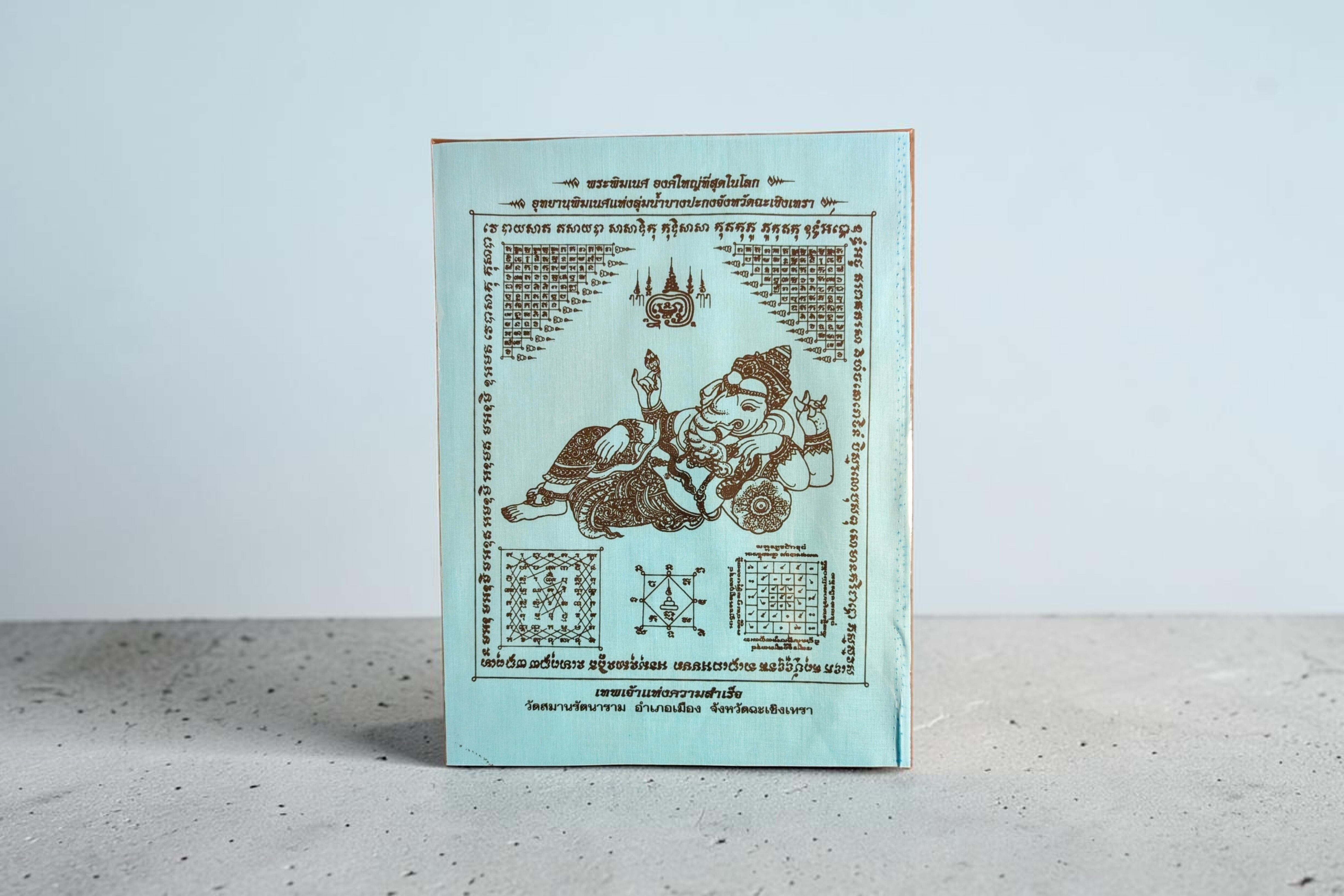 タイ・チャチュンサオ県が誇る最強のパワースポット「ワット・サマーン・ラッタナラム」にて、実際に祈祷(プッタピセーク)を受けた聖なる布、パーヤンです。中央には、あらゆる困難を打ち砕き、最速で願いを叶えると言われる「寝そべりガネーシャ神」が描かれ、周囲は神聖な幾何学模様「ヤント」で囲まれています。