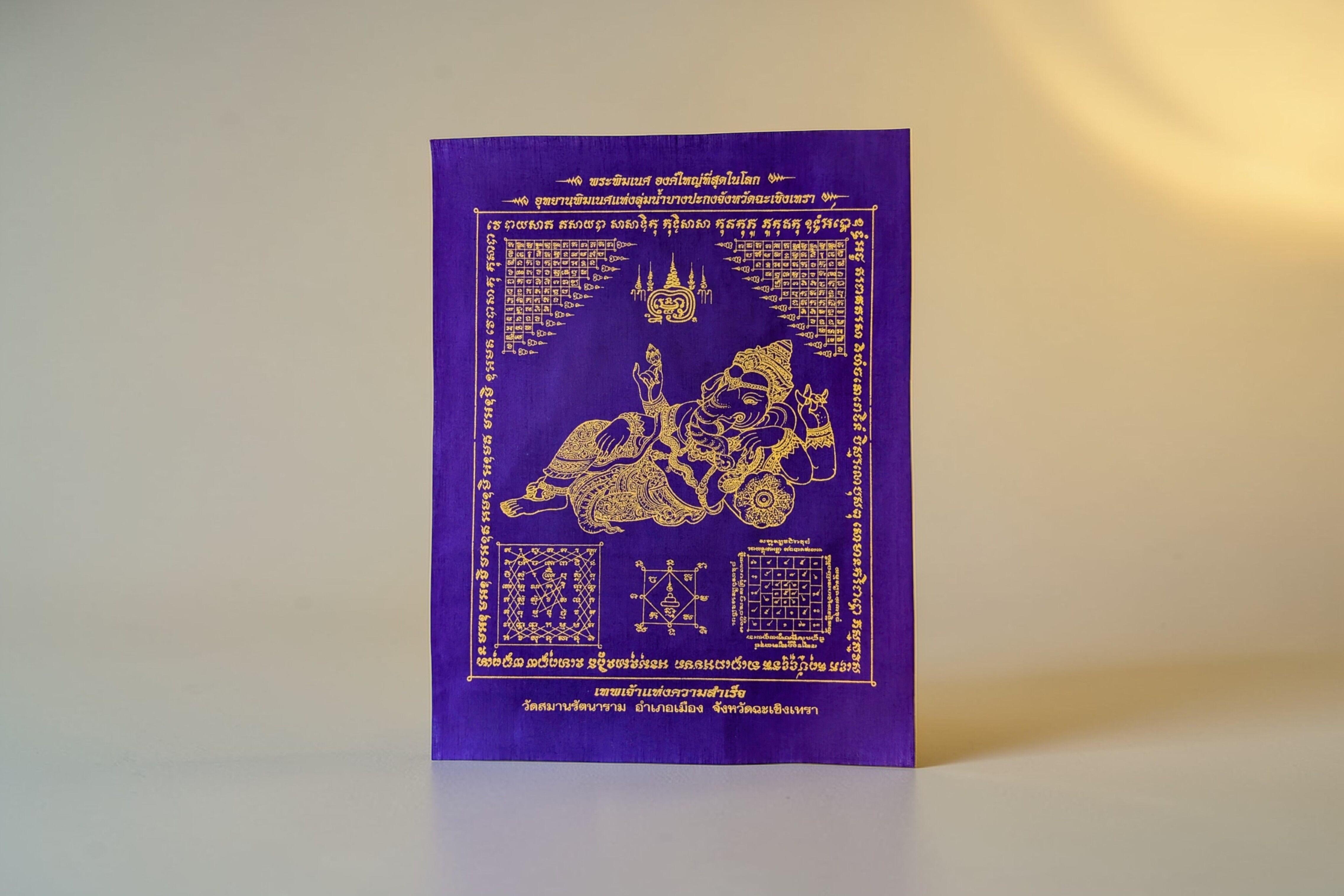タイ・チャチュンサオ県が誇る最強のパワースポット「ワット・サマーン・ラッタナラム」にて、実際に祈祷(プッタピセーク)を受けた聖なる布、パーヤンです。中央には、あらゆる困難を打ち砕き、最速で願いを叶えると言われる「寝そべりガネーシャ神」が描かれ、周囲は神聖な幾何学模様「ヤント」で囲まれています。