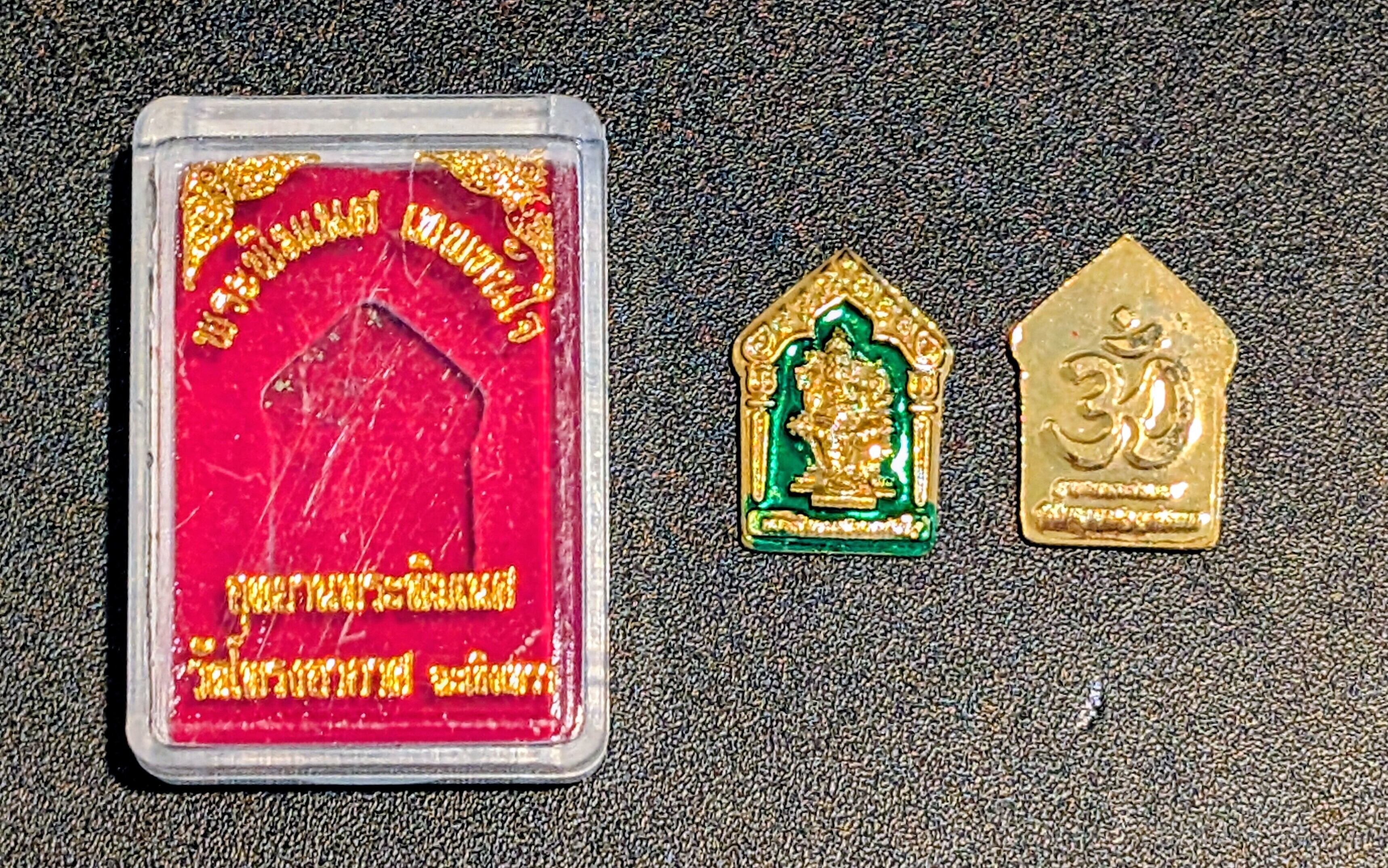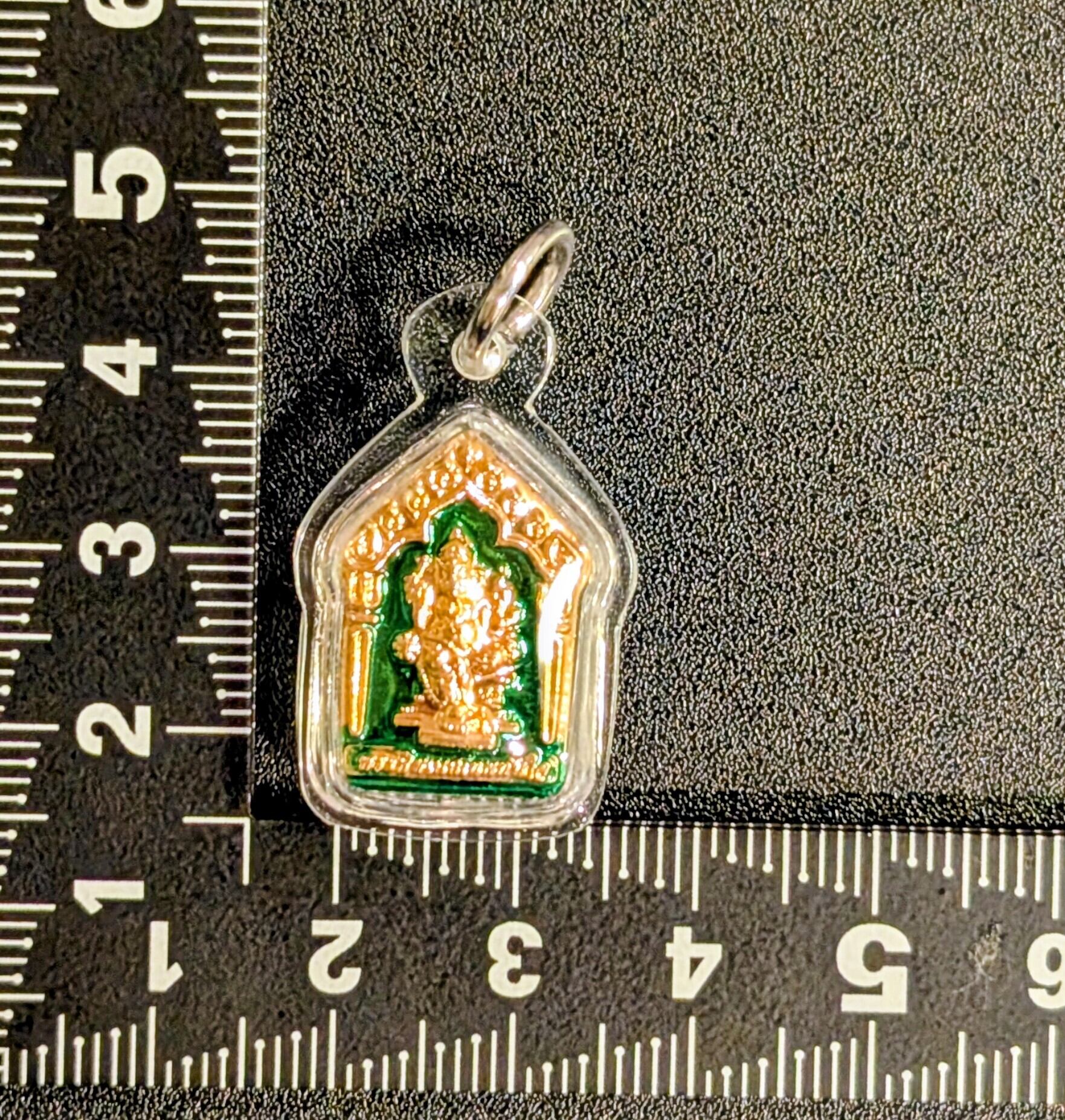 タイ・チャチュンサオ県の巨大なガネーシャ像で知られる聖地「ウッタヤーンプラピッカネート(ワット・プローンアーカート)」より、心強いお守りが届きました。この「テープタンジャイ」とは、タイ語で「即座に願いを叶える神様」を意味します。滞っている物事を動かし、スピーディーに幸運を引き寄せたい方にぴったりの小型リアンです。小ぶりで軽量タイプはペンダントトップはもちろん、バッグのチャームやスマホのストラップとしても違和感なくお使いいただけます。神々しくも親しみやすいデザインが、あなたの毎日を明るく守護します。プラスチックガンナーム枠入り。元箱あり。本寺にて入手。店長より、サービスでストラップ用組紐を2本お付け致します。