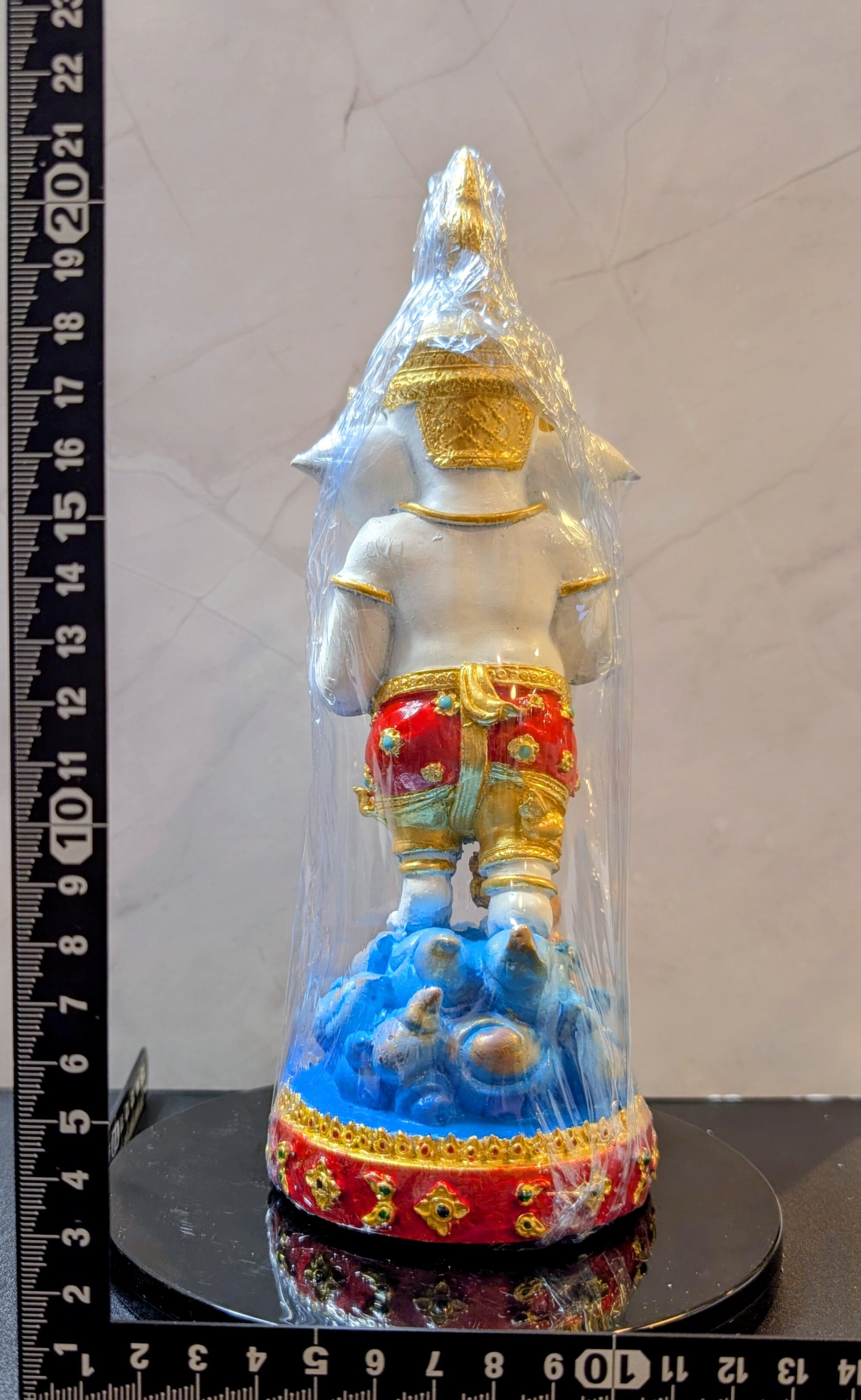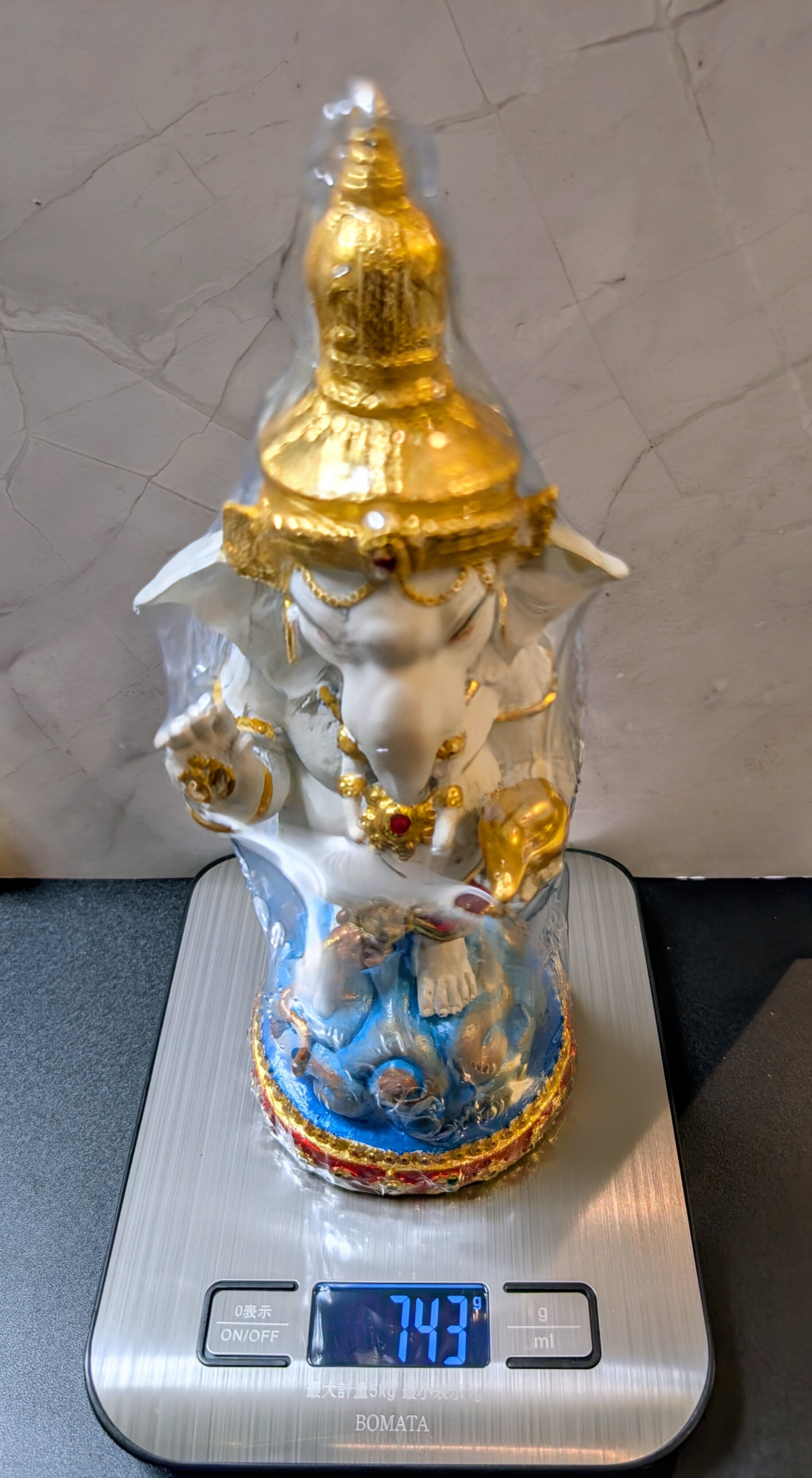 バンコクの古刹ワット・サイのプラ・アジャーン・ポン師によって、2017年(仏暦2560年)に奉献されたガネーシャ像シリーズです。雲の上に堂々と立ち、足元には忠実な使いであるネズミ(ムーシカ)を従えたこの姿は、あらゆる困難を乗り越え、持ち主を成功へと導く「勝利」のポーズを象徴しています。気高く清らかな白のボディは、浄化、平穏、知恵、そして心の静寂と正しい判断力を象徴します。人間関係を円滑にし、家庭や職場に調和をもたらしたい方、学問や研究に励む方に最適です。造形的には、細部まで精緻に表現されたレジン製のボディに、タイの伝統的な色彩設計が施されています。また右手の手のひらには、宇宙の根源を表す聖音「オーム」が記されており、常に聖なる波動を放っています。アジャーン・ポン師による祈祷により、金運・商売繁盛の功徳が込められた、実利を求める現代人に寄り添う一体です。専門店より入手。