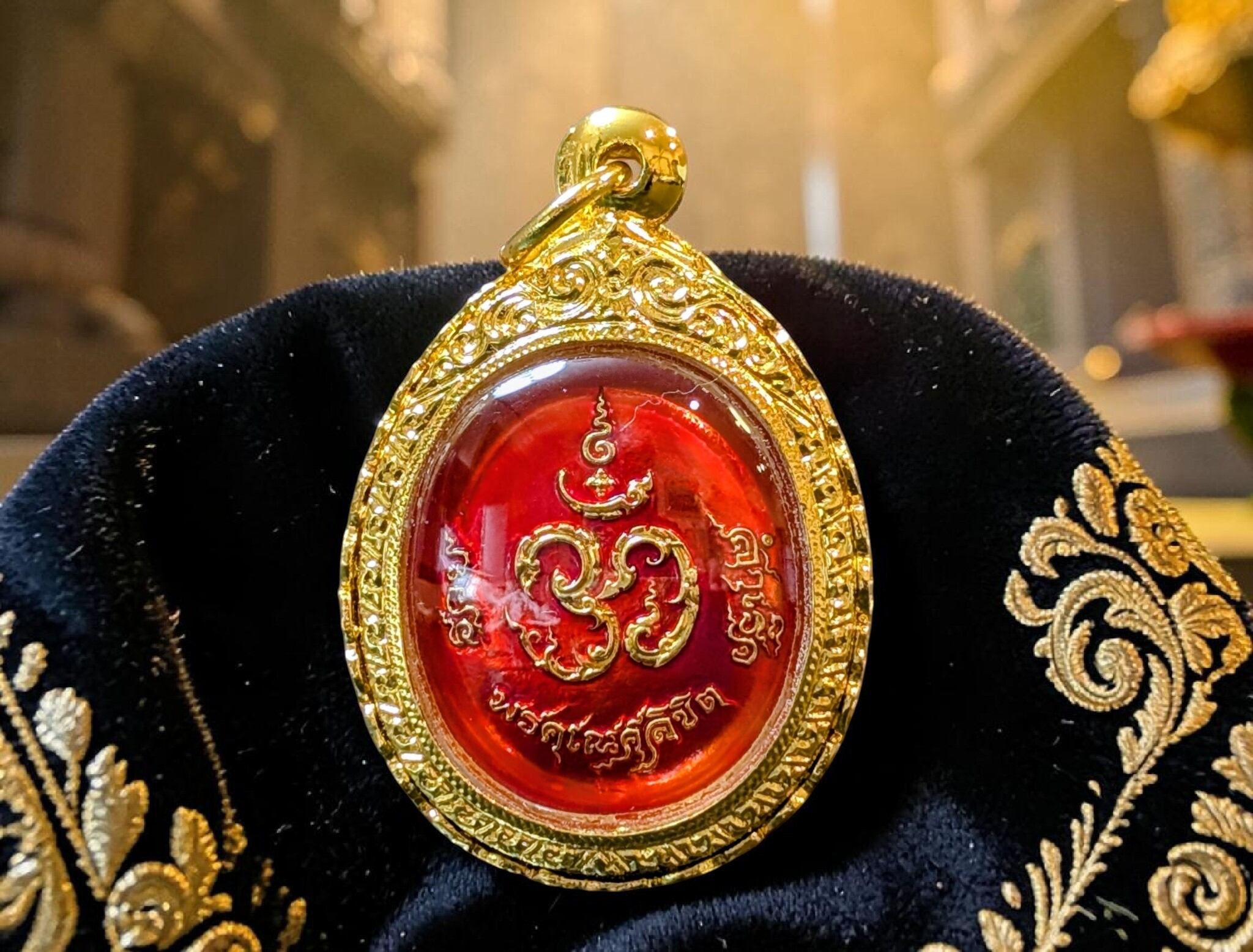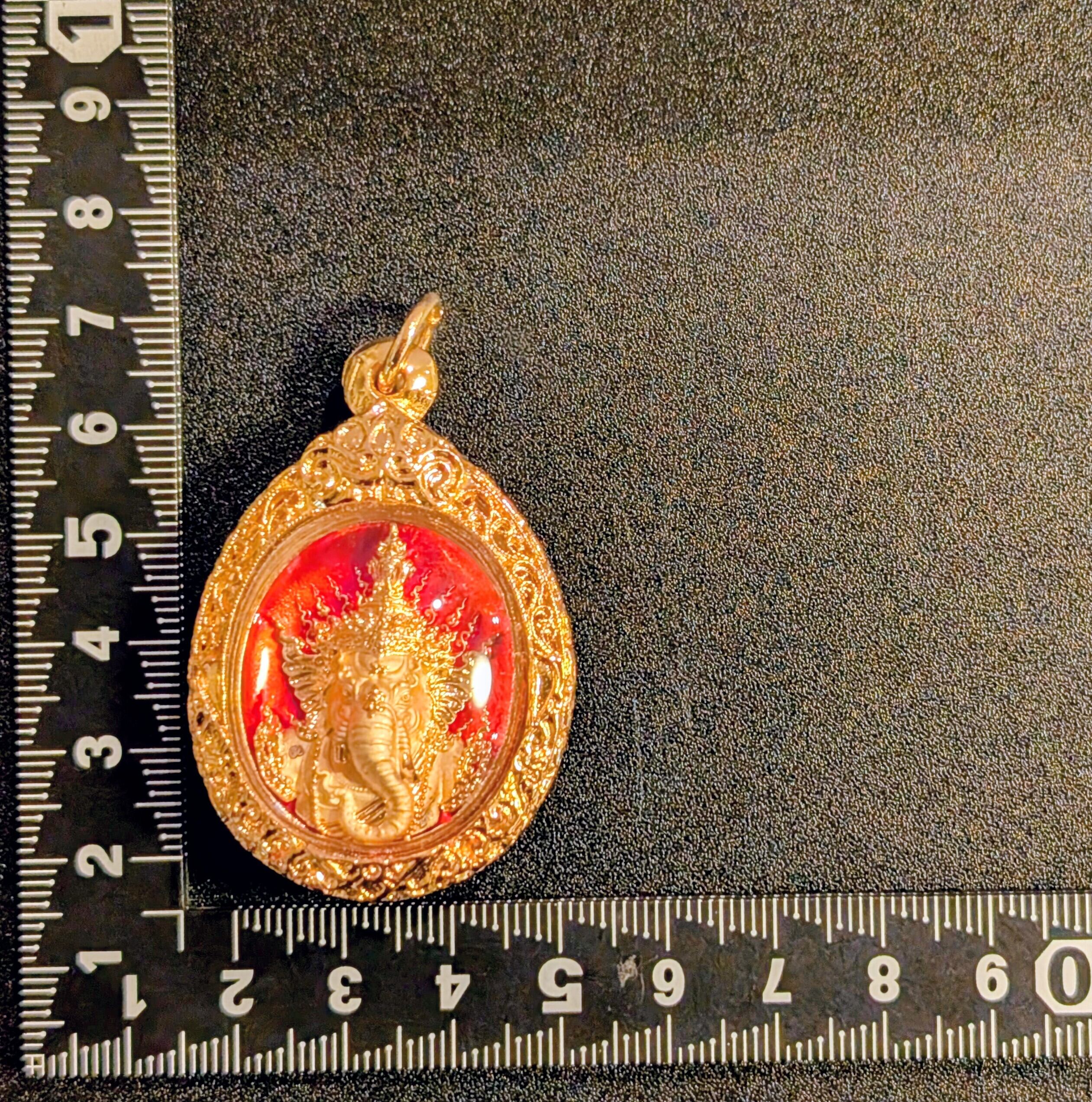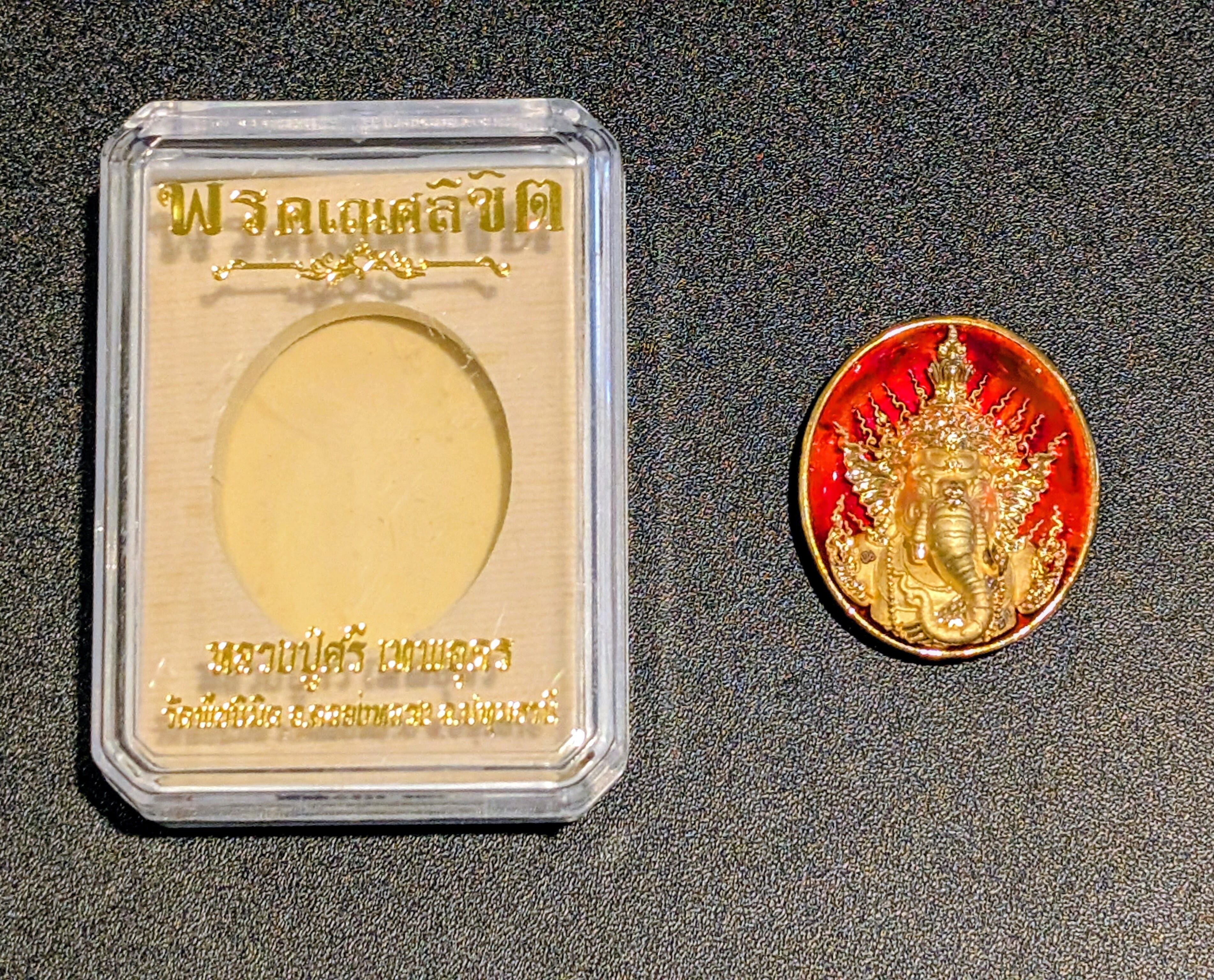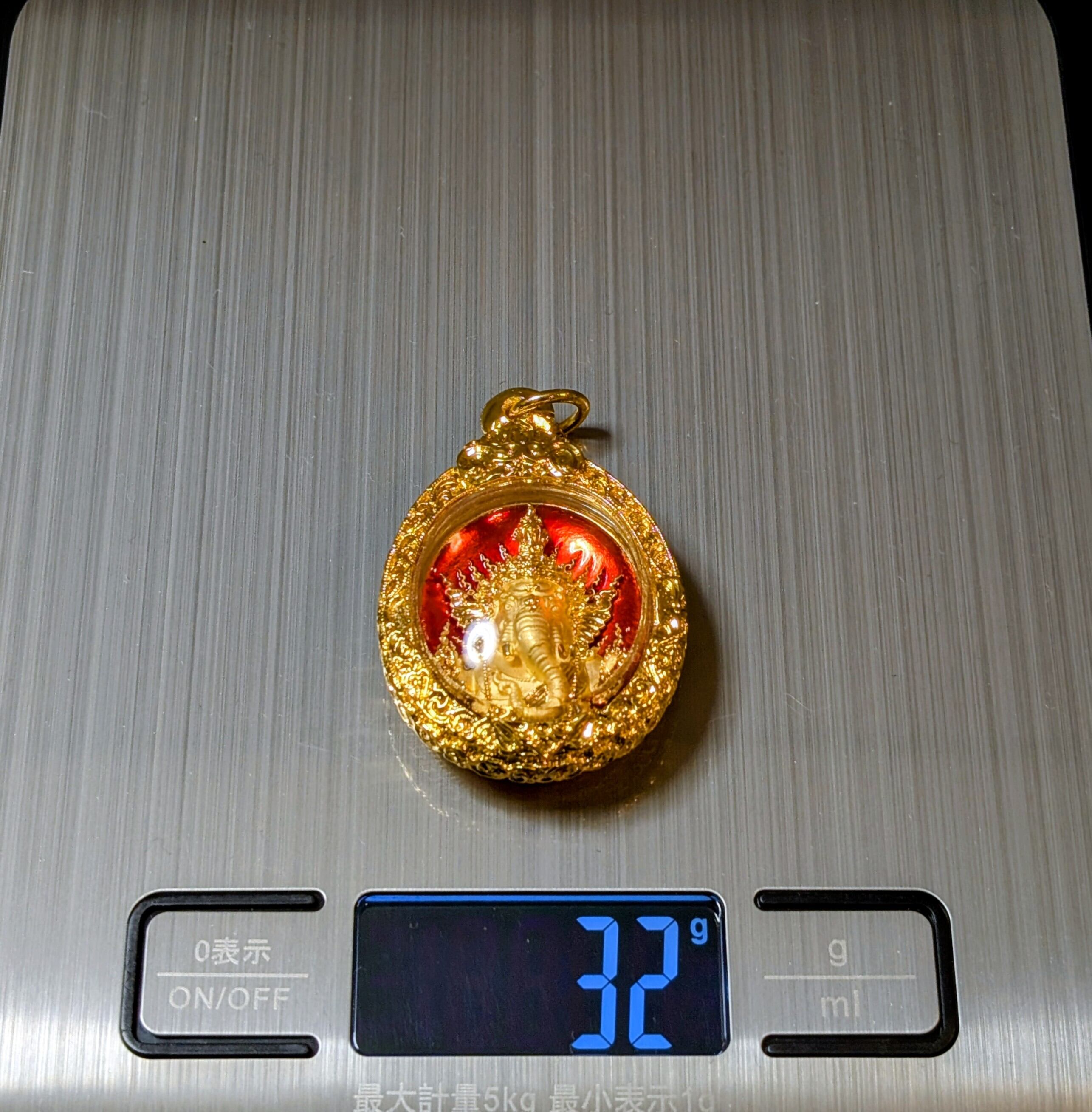 タイのウドーンターニー県に座する名僧、ルアン・プーシー・テープウドン師が手掛けたこのお守りは、芸術的な美しさと強力な精神的守護を兼ね備えた逸品です。ガネーシャ(プラ・ピッカネー)は「障害を取り除き、成功をもたらす神」として、学問、芸術、そして商売繁盛の守護神として深く信仰されています。本シリーズは、緻密な彫刻と鮮やかな色彩(ロンヤー)が特徴で、所有者の運気を切り開き、願いを現実へと導く「リキット(運命を記す)」の力を宿しているとされています。本プラは、サムリット(青銅合金)に金メッキを施し、鮮やかな赤のロンヤー(エナメル装飾)で仕上げられており、燃えるような赤は「活力」と「情熱」を象徴し、金色のガネーシャがその中心で輝きます。周囲の装飾は炎のように力強く、持ち主に困難を打ち破る勇気と、華やかな成功をもたらすと信じられています。限定999個発行。トーンマイクローン枠入り。元箱あり。専門店より入手。