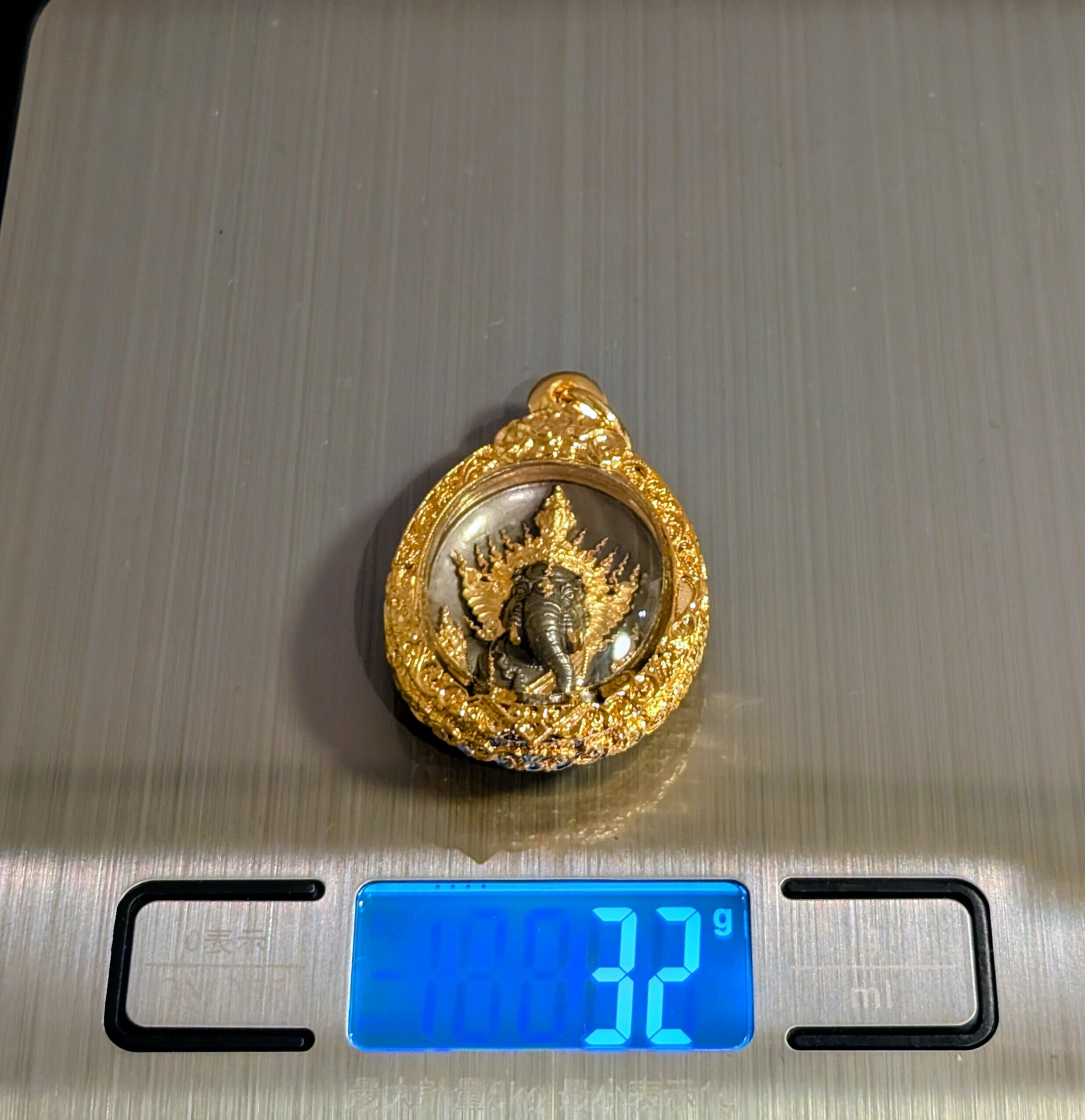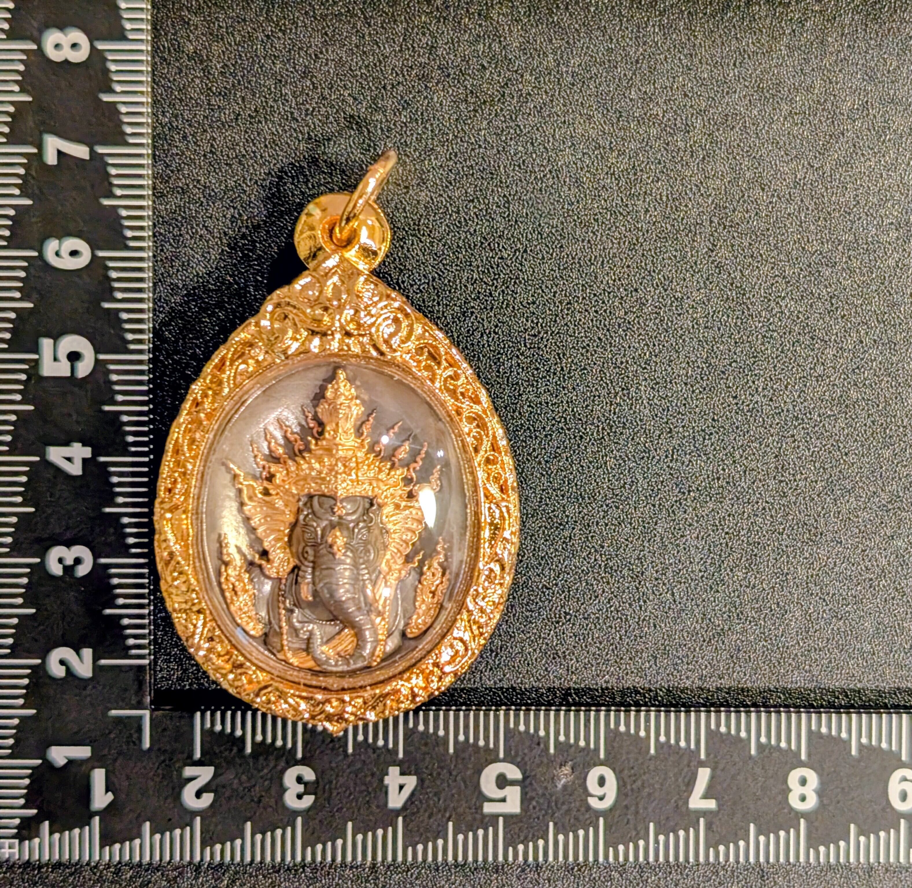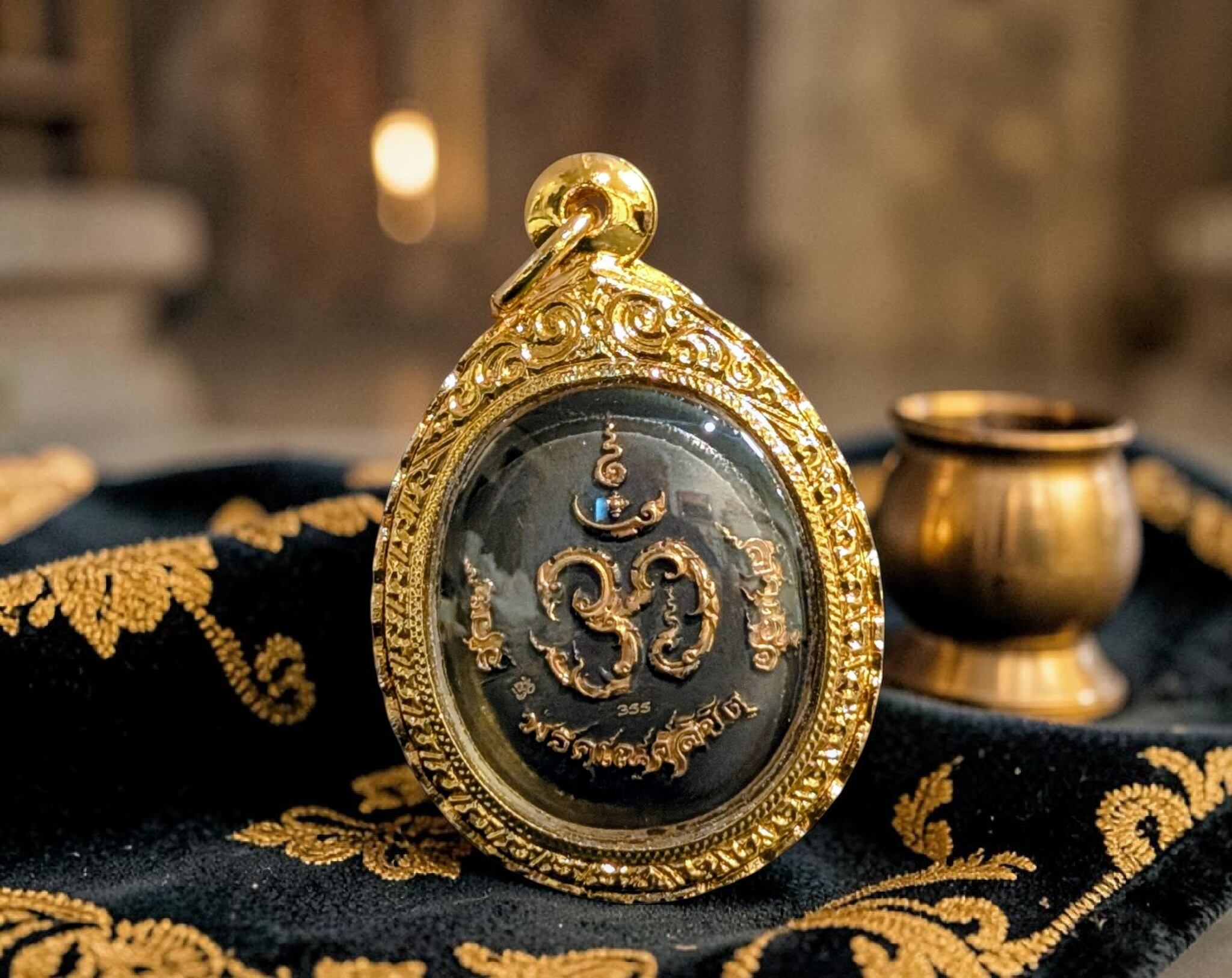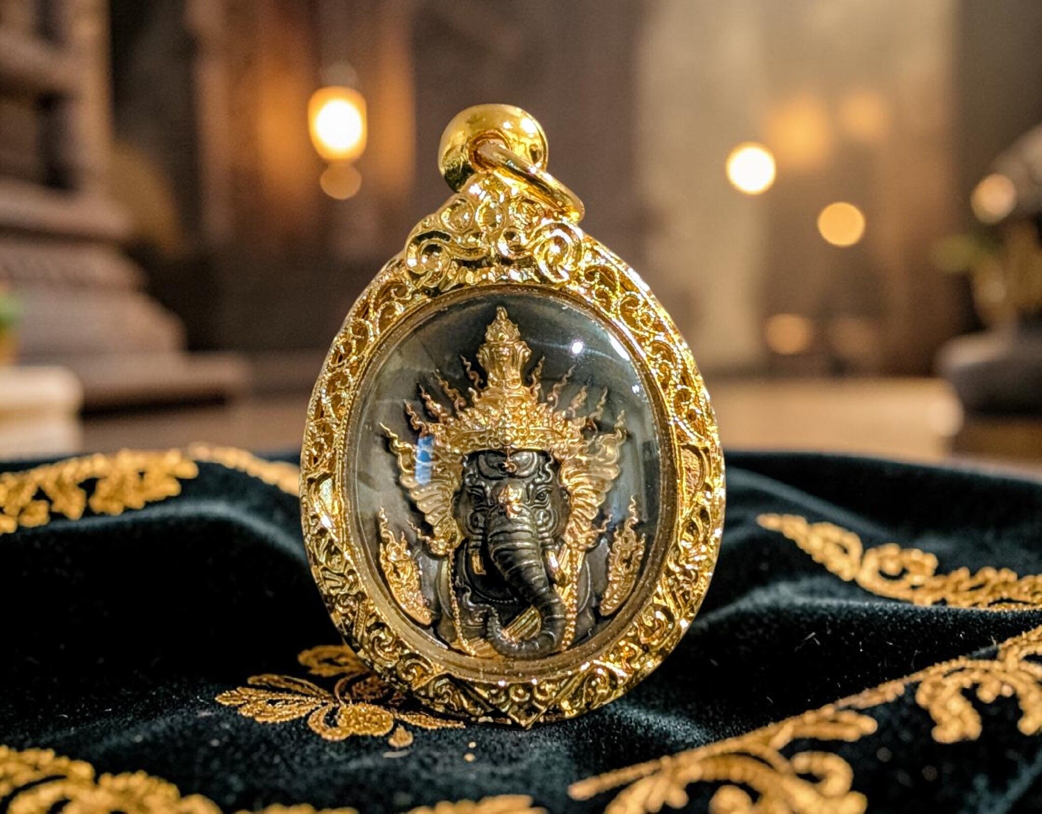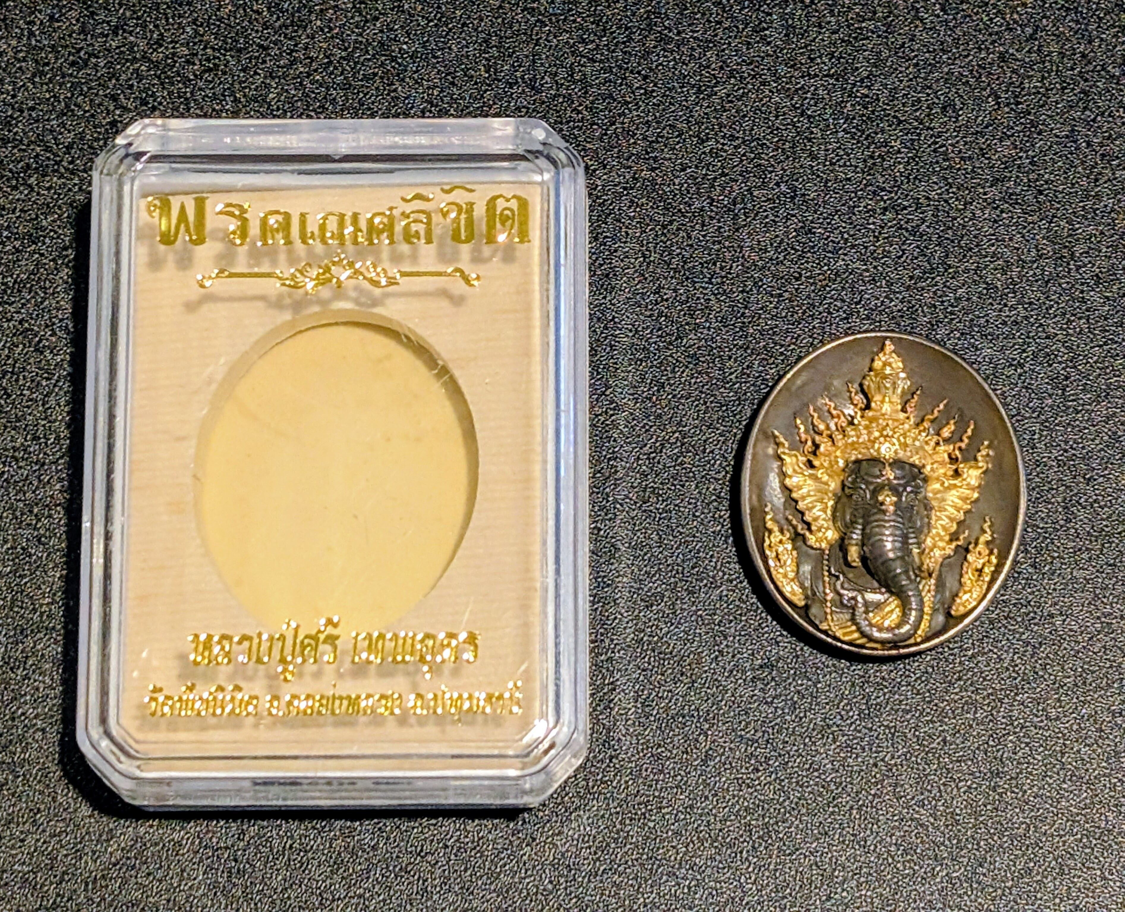 タイのウドーンターニー県に座する名僧、ルアン・プーシー・テープウドン師が手掛けたこのお守りは、芸術的な美しさと強力な精神的守護を兼ね備えた逸品です。ガネーシャ(プラ・ピッカネー)は「障害を取り除き、成功をもたらす神」として、学問、芸術、そして商売繁盛の守護神として深く信仰されています。本シリーズは、緻密な彫刻と鮮やかな色彩(ロンヤー)が特徴で、所有者の運気を切り開き、願いを現実へと導く「リキット(運命を記す)」の力を宿しているとされています。本プラは、聖なる金属の混合物である「シャヌワン」をベースに、伝統的な黒染め(ロンヒン)を施し、要所に金彩を添えています。さらに深みのある黒とマットな質感のコントラストが、ガネーシャの神聖な威厳を際立たせています。落ち着いた風格を持ち、勝負事やビジネスにおける「揺るぎない決断力」と「守護」を求める方に最適な、力強いお守りです。限定999個発行。トーンマイクローン枠入り。元箱あり。専門店より入手。